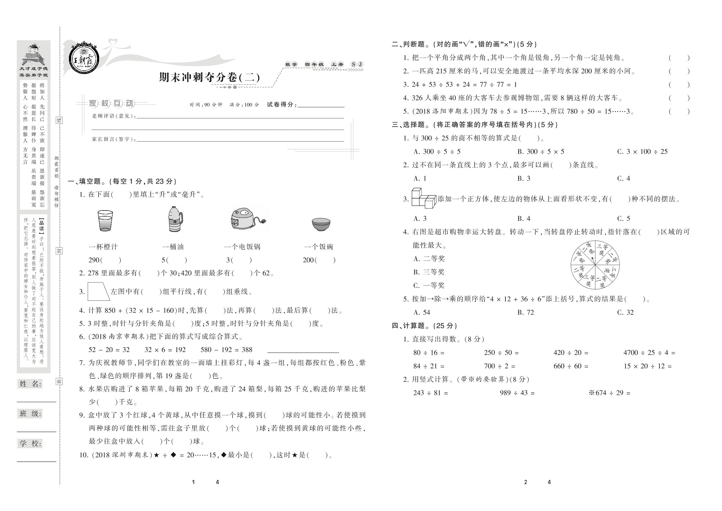 2020上册三年级数学苏教版 期末冲刺夺分卷(二)_R210922173106606
