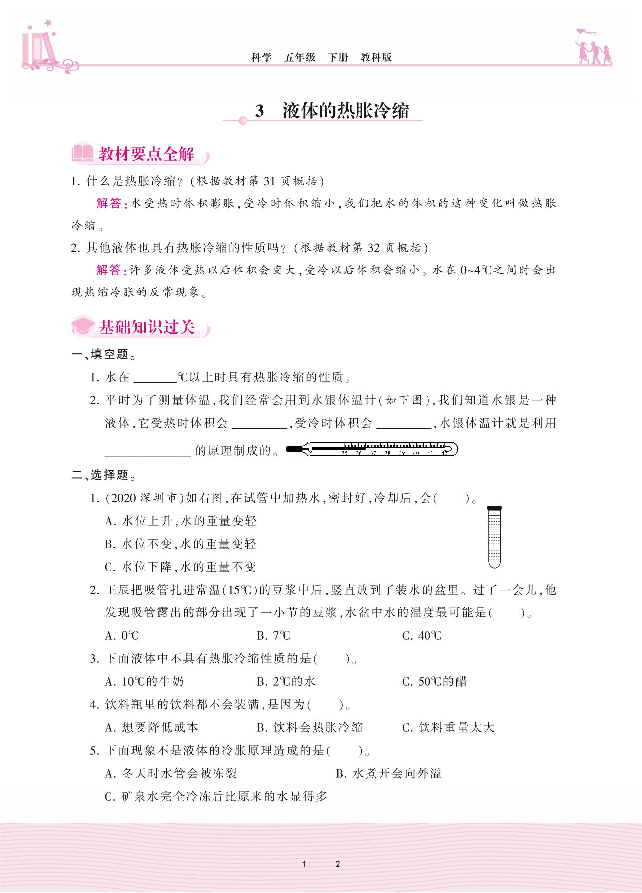2021下册五年级科学教科版 第二单元 热——3 液体的热胀冷缩