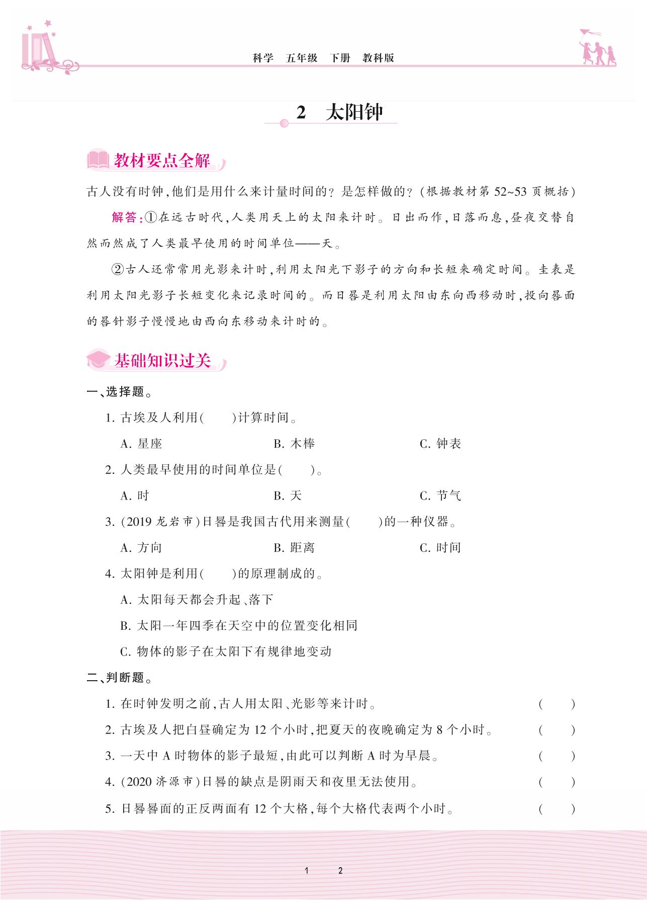 2021下册五年级科学教科版 第三单元 时间的测量——2 太阳钟