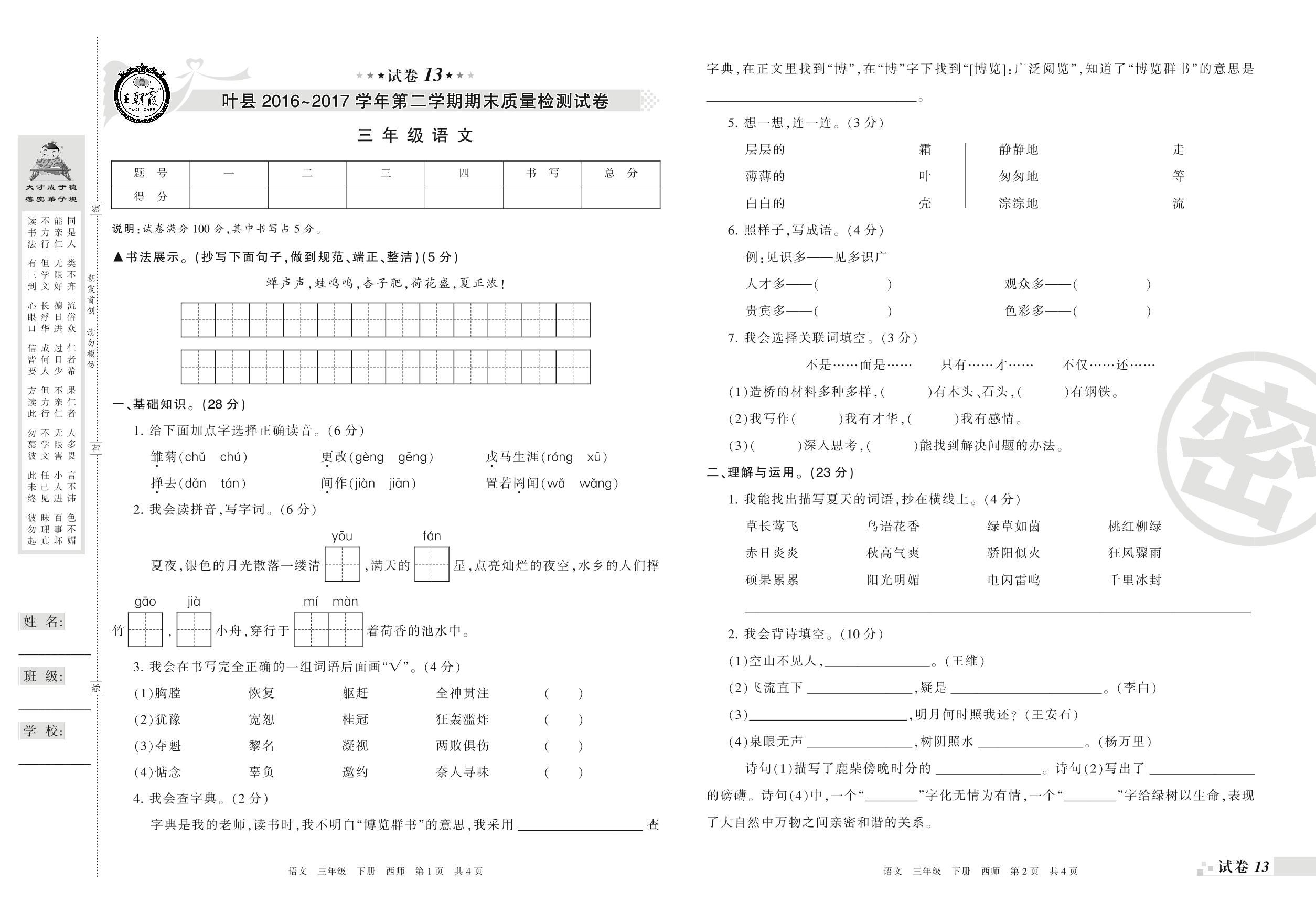 2016-2017学年第二学期平顶山市叶县三年级语文试卷(西师版)【13】