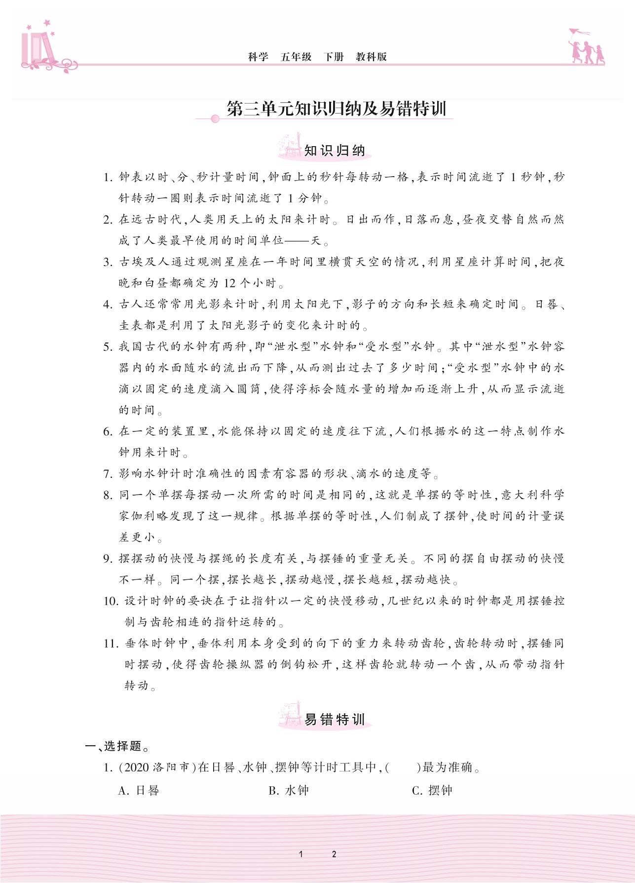 2021下册五年级科学教科版 第三单元 时间的测量——第三单元知识归纳及易错特训