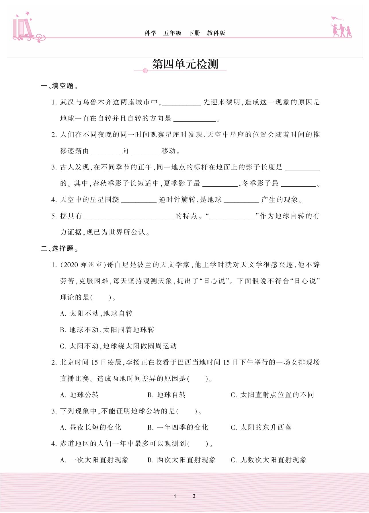 2021下册五年级科学教科版 第四单元 地球的运动——第四单元检测