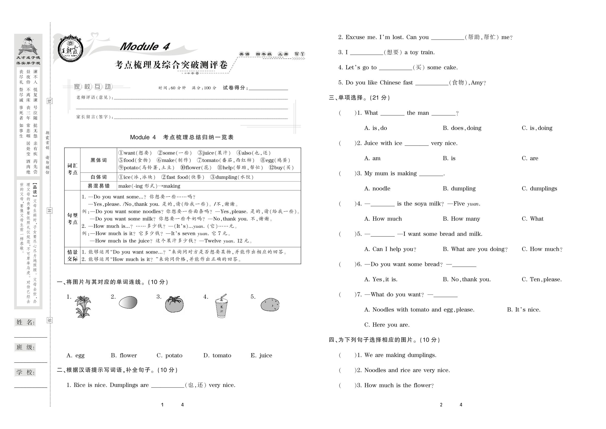 2020上册四年级英语外研版 Module 4 考点梳理及综合突破测评卷