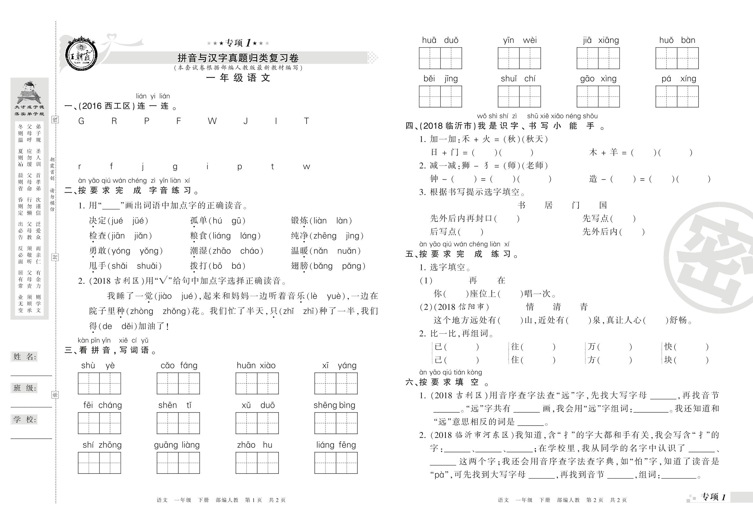 王朝霞期末专项卷——拼音与汉字、词语与句子真题归类复习一年级下册语文(人教版)