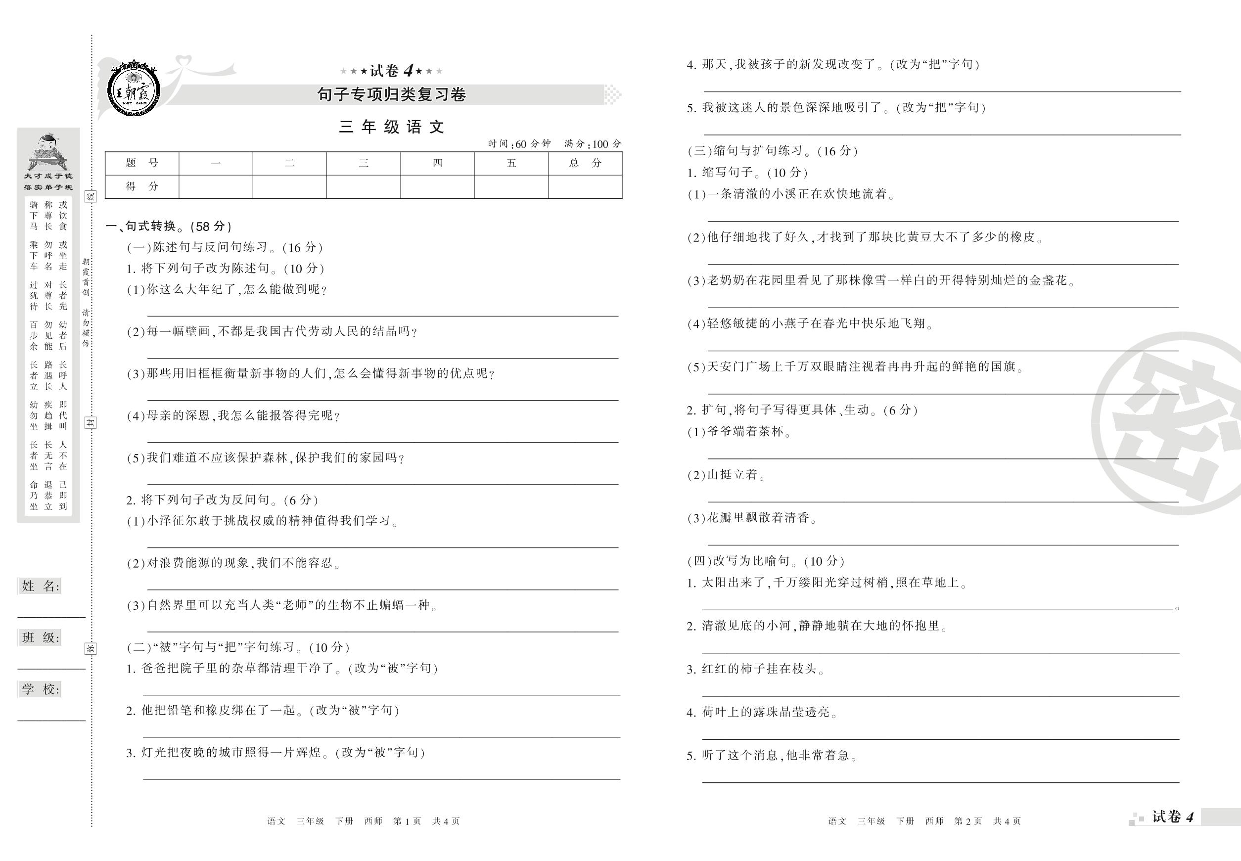 王朝霞期末专项卷——句子专项归类复习卷三年级下册语文(西师版)_R210801104209【4】