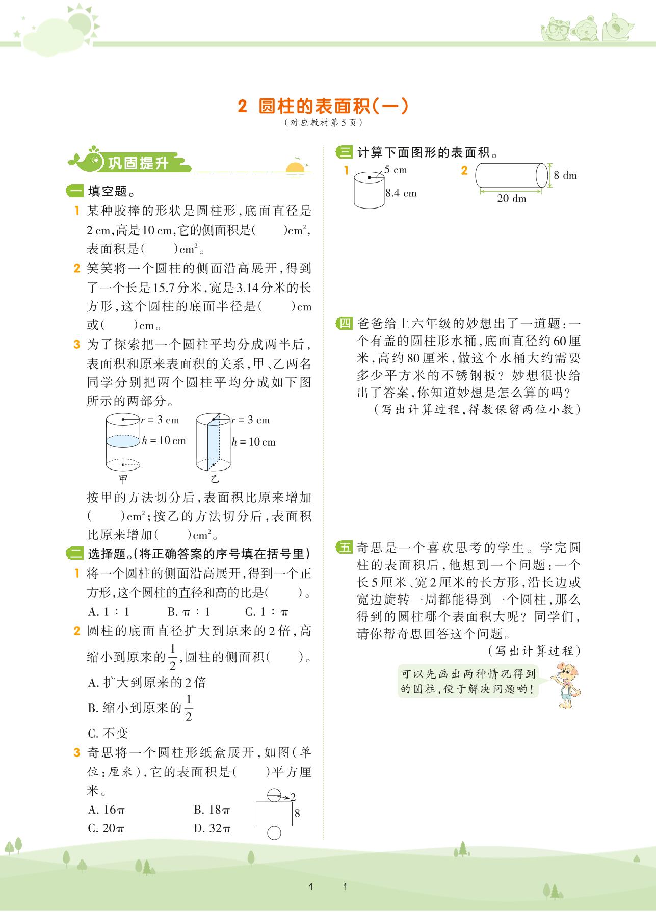 2021下册六年级数学北师版 第一单元 圆柱和圆锥——2 圆柱的表面积(一)