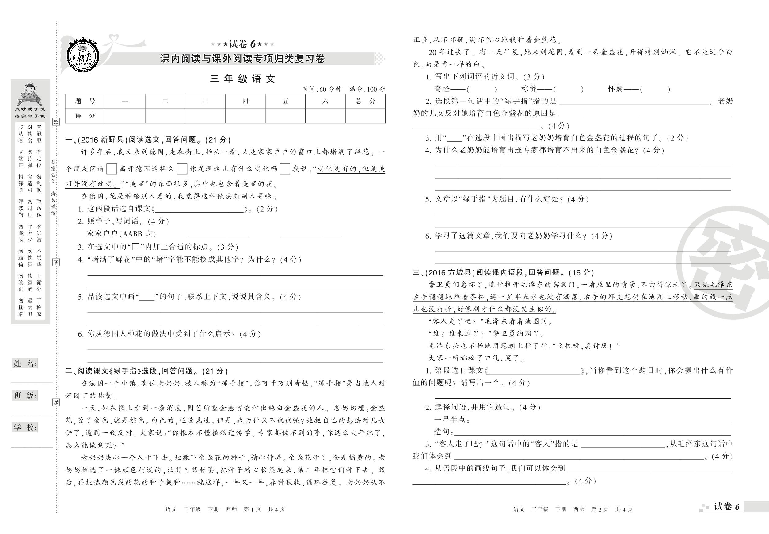 王朝霞期末专项卷——课内阅读与课外阅读专项归类复习卷三年级下册语文(西师版)_R210801104216【6】