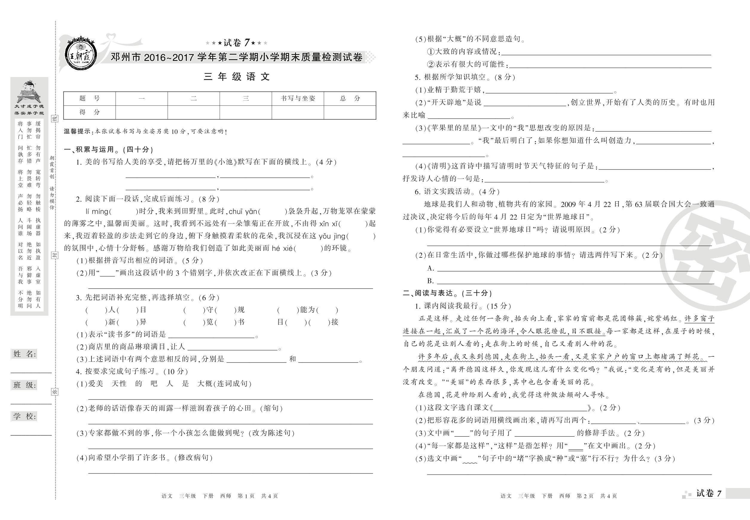 2016-2017学年第二学期邓州市三年级语文试卷(西师版)【7】