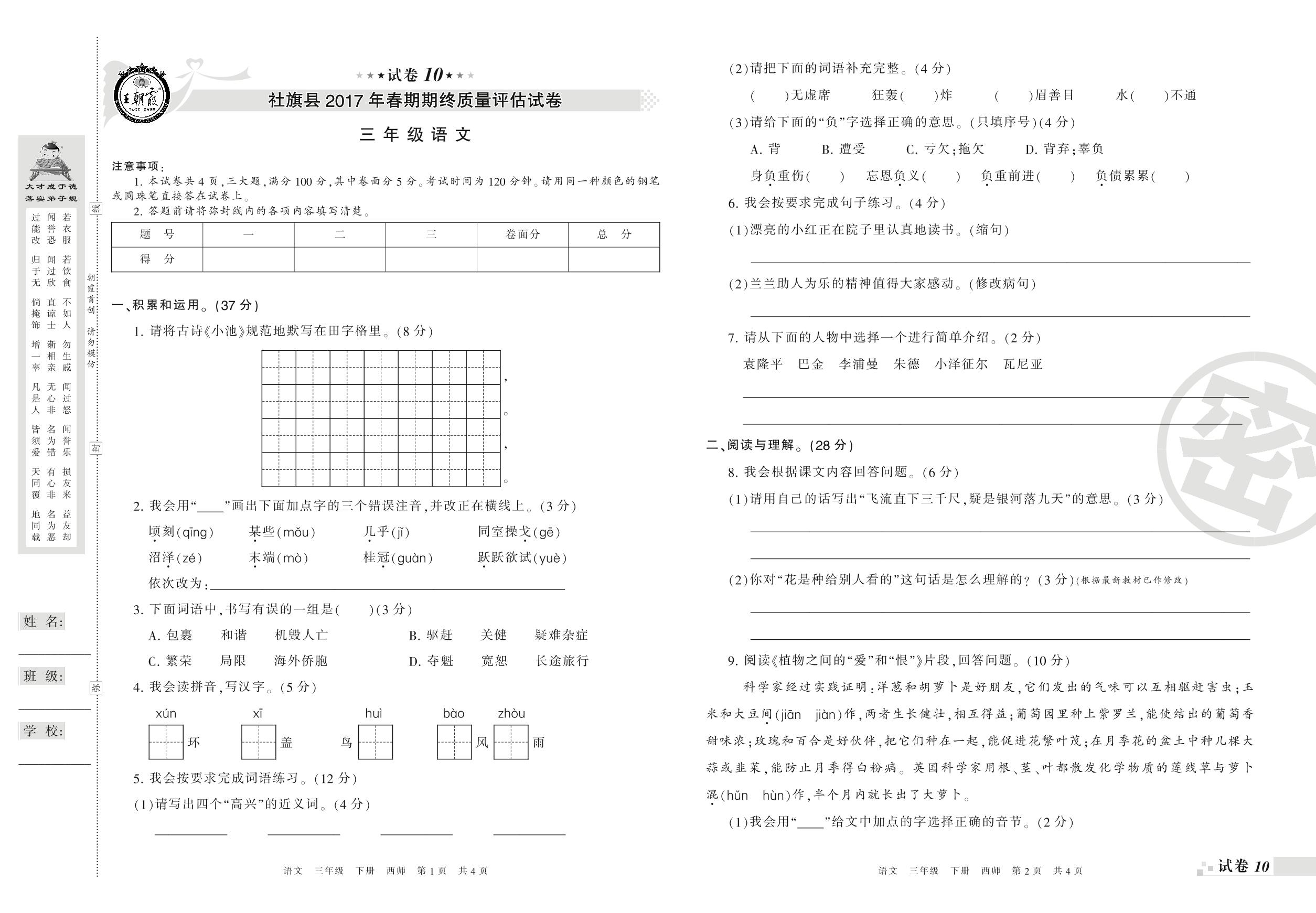 2016-2017学年第二学期南阳市社旗县三年级语文试卷(西师版)【10】