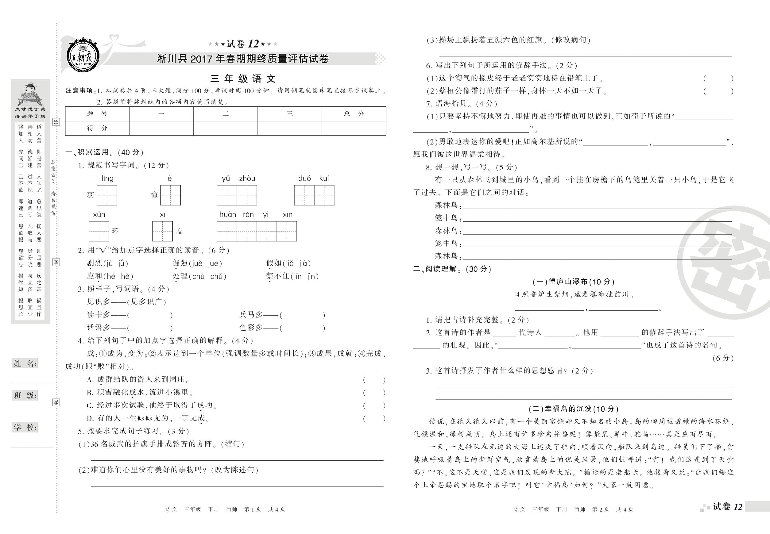 2016-2017学年第二学期南阳市淅川县三年级语文试卷(西师版)【12】