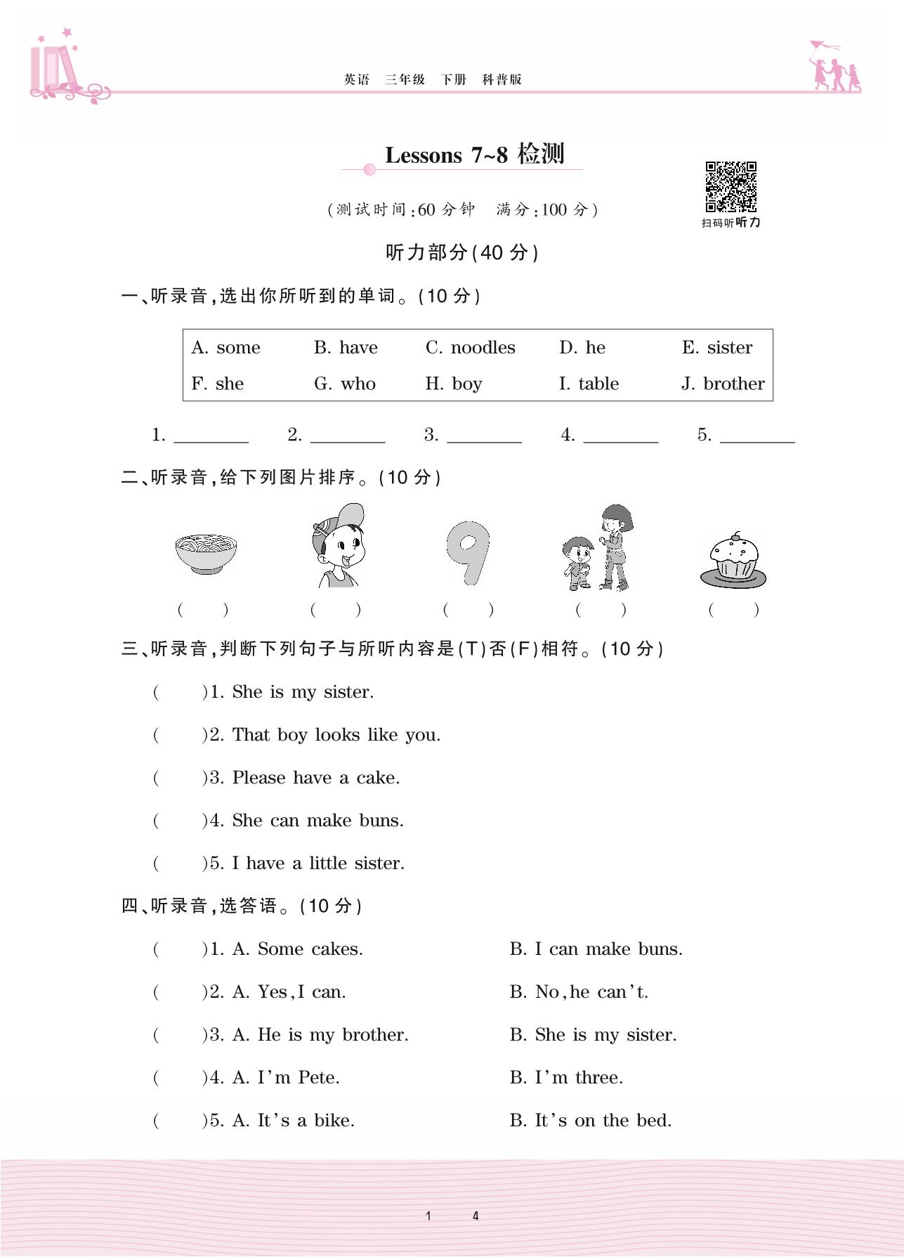 2021下册三年级英语科普版 Lessons 7~8检测