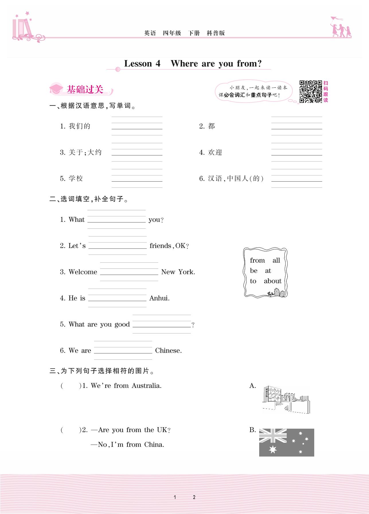 2021下册四年级英语科普版 Lesson 4 Where are you from?