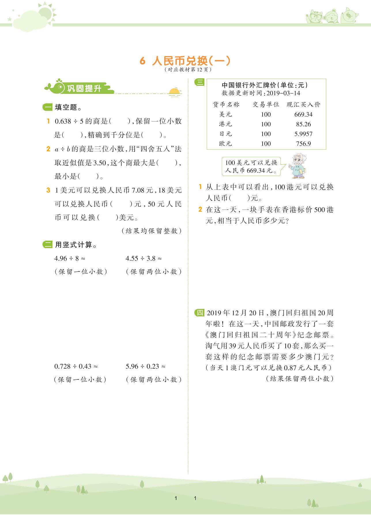 2020上册五年级数学北师版 第一单元 小数除法——6 人民币兑换(一)