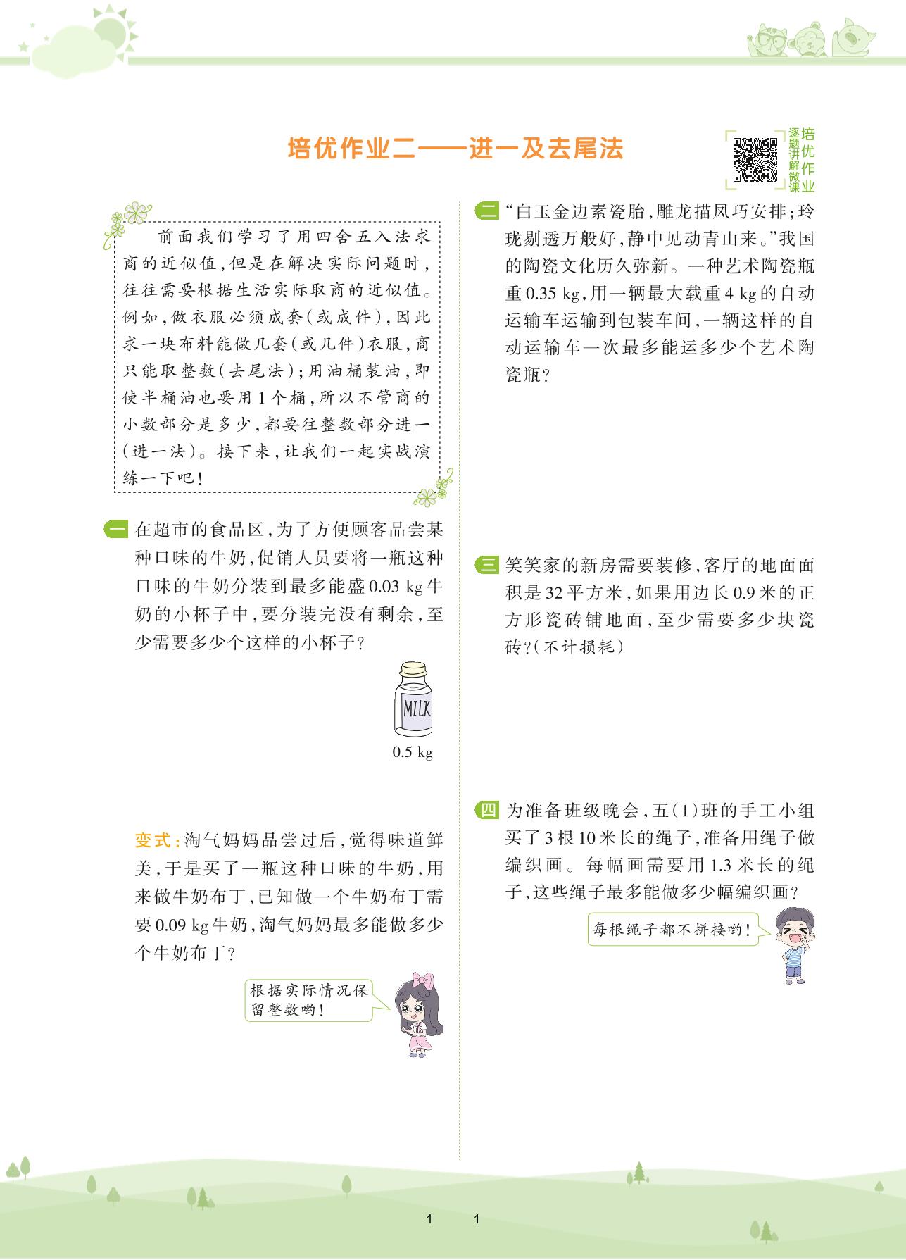 2020上册五年级数学北师版 第一单元 小数除法——培优作业二 进一及去尾法
