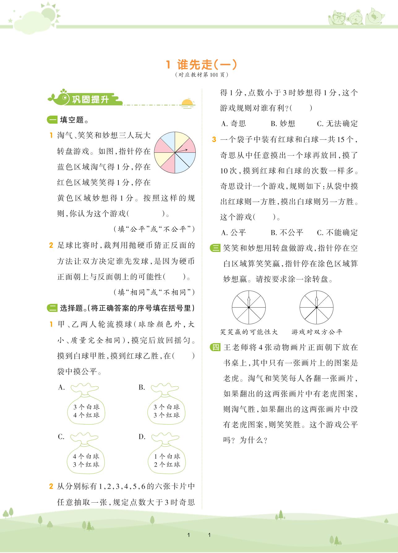 2020上册五年级数学北师版 第七单元 可能性——1 谁先走(一)
