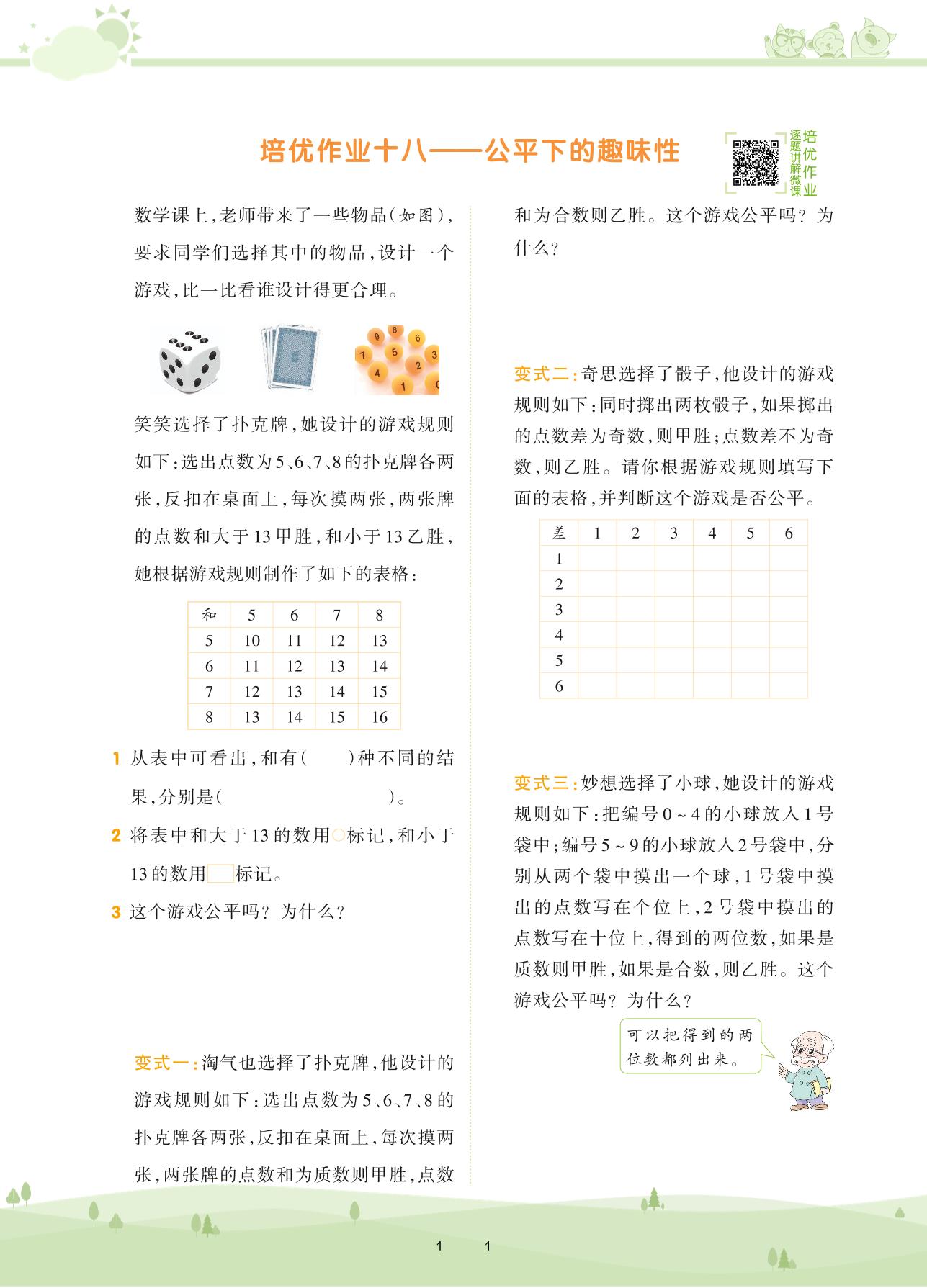 2020上册五年级数学北师版 第七单元 可能性——培优作业十八 公平下的趣味性