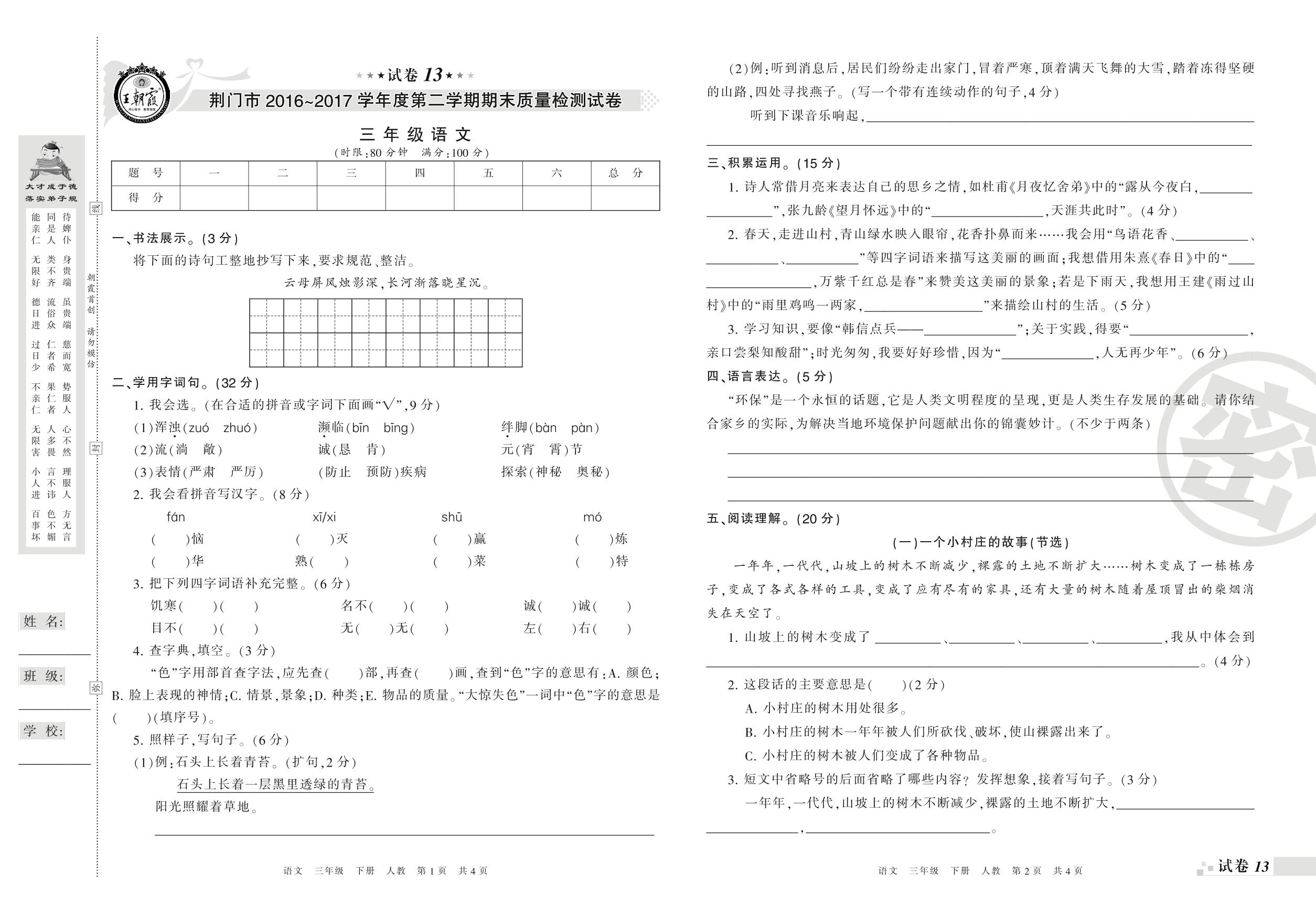 2016-2017学年第二学期荆门市三年级语文试卷(人教版)【13】