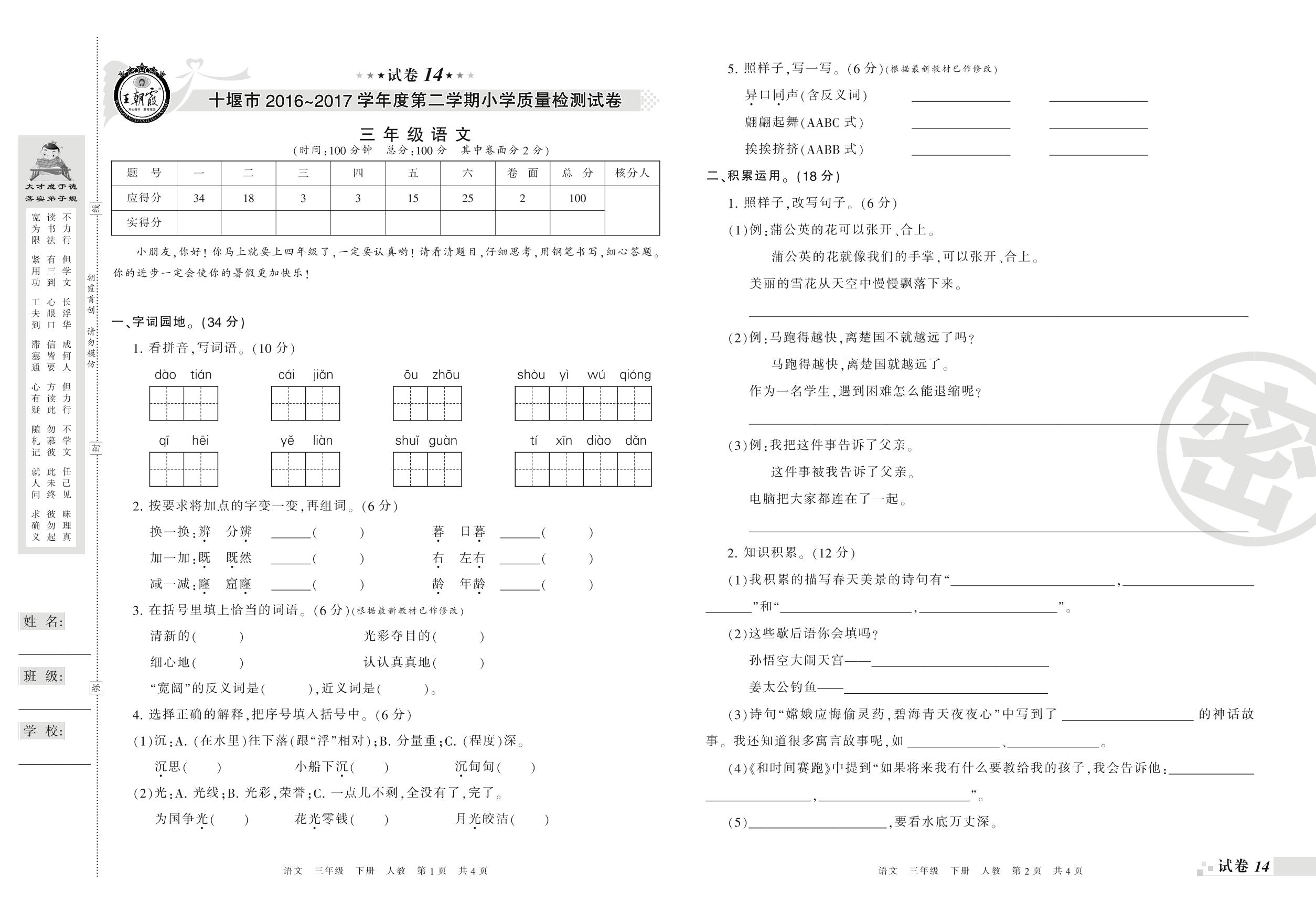 2016-2017学年第二学期十堰市三年级语文试卷(人教版)【14】