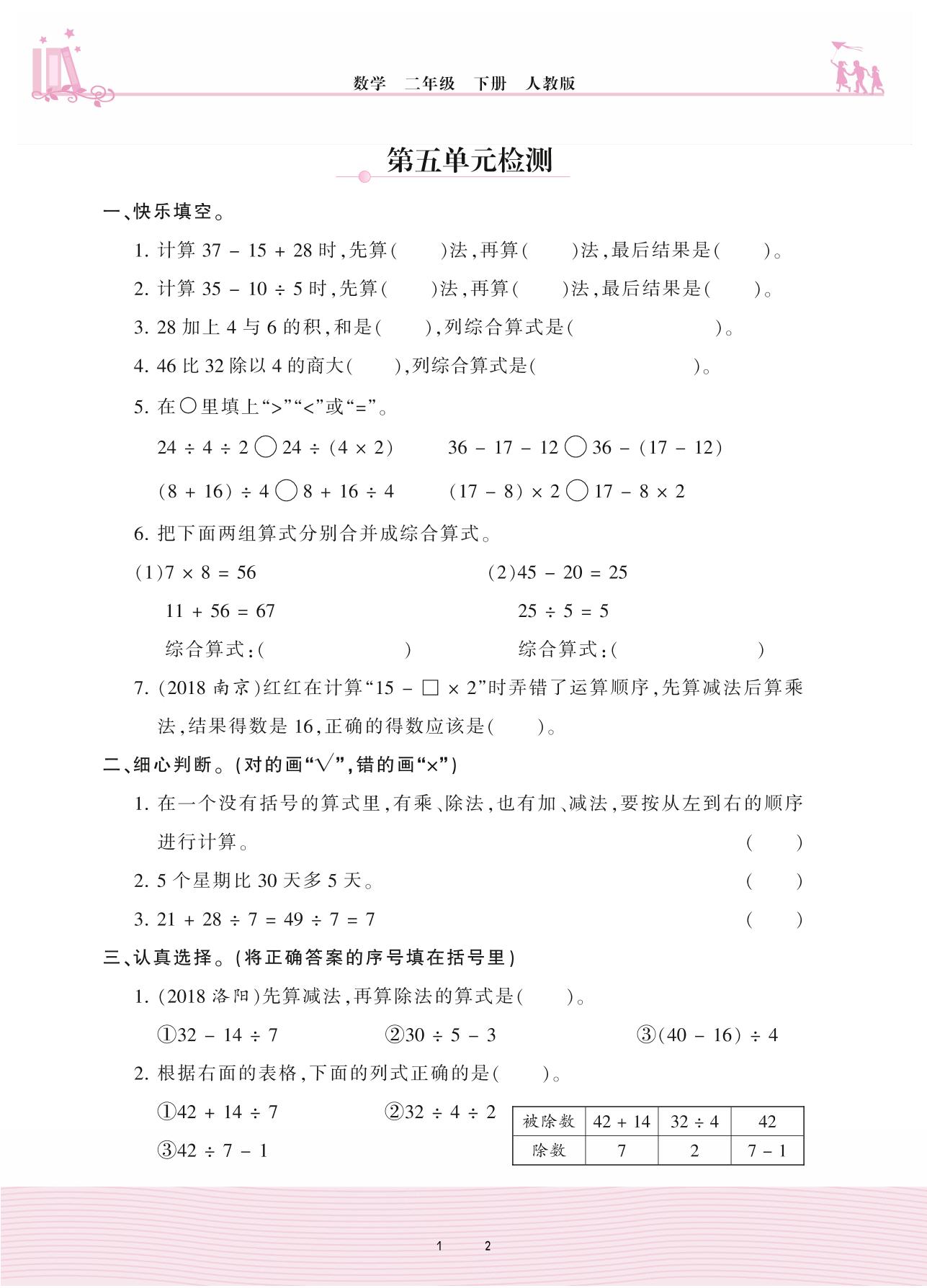 2021下册二年级数学人教版 5 混合运算——第五单元检测
