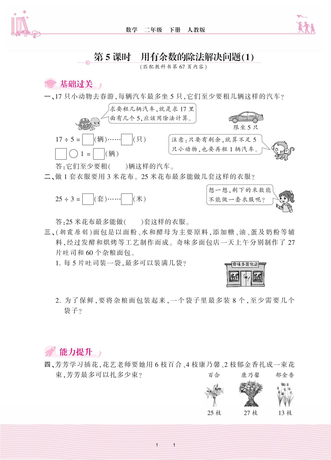 2021下册二年级数学人教版 6 有余数的除法——第5课时 用有余数的除法解决问题(1)
