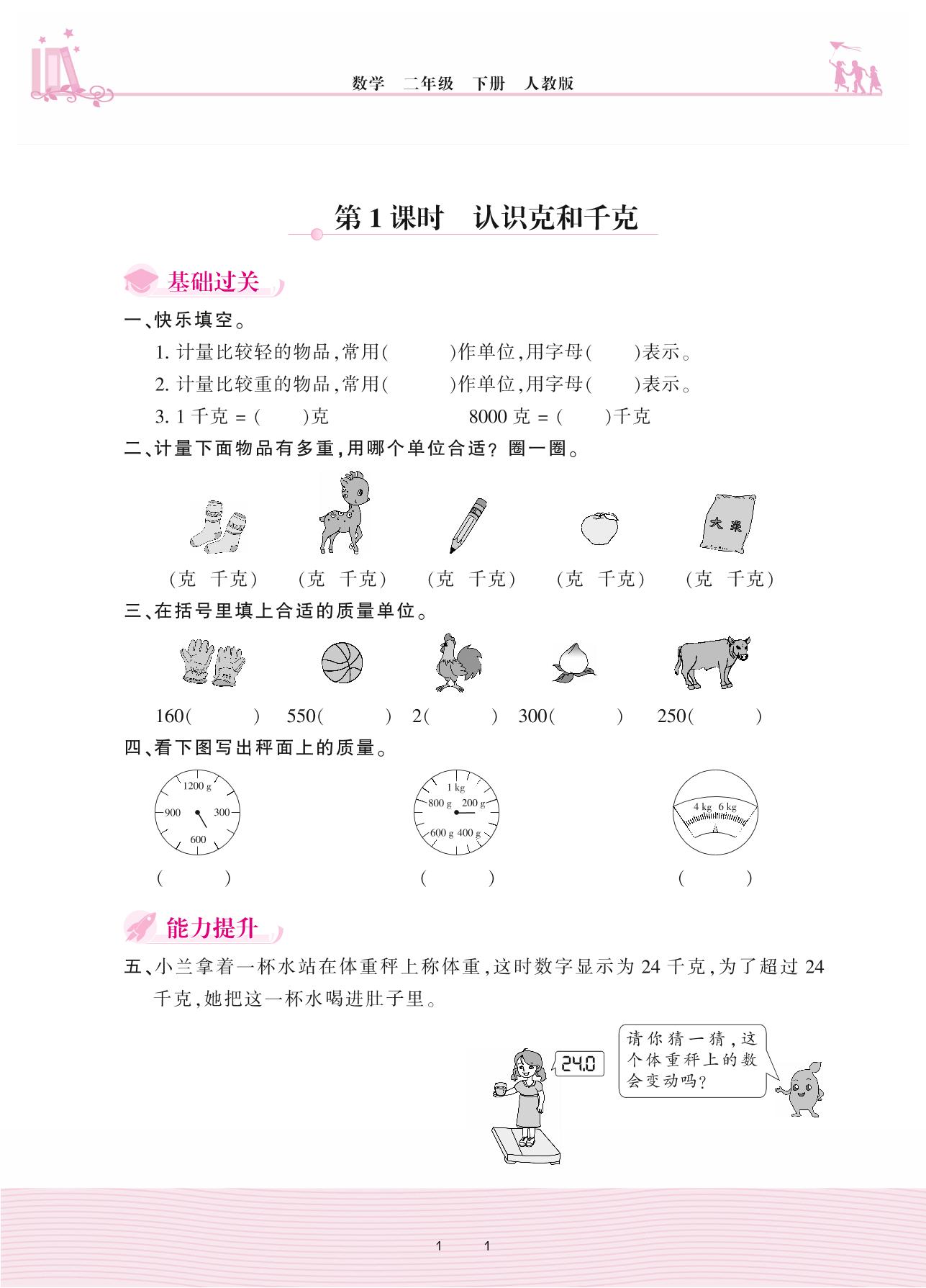2021下册二年级数学人教版 8 克和千克——第1课时 认识克和千克