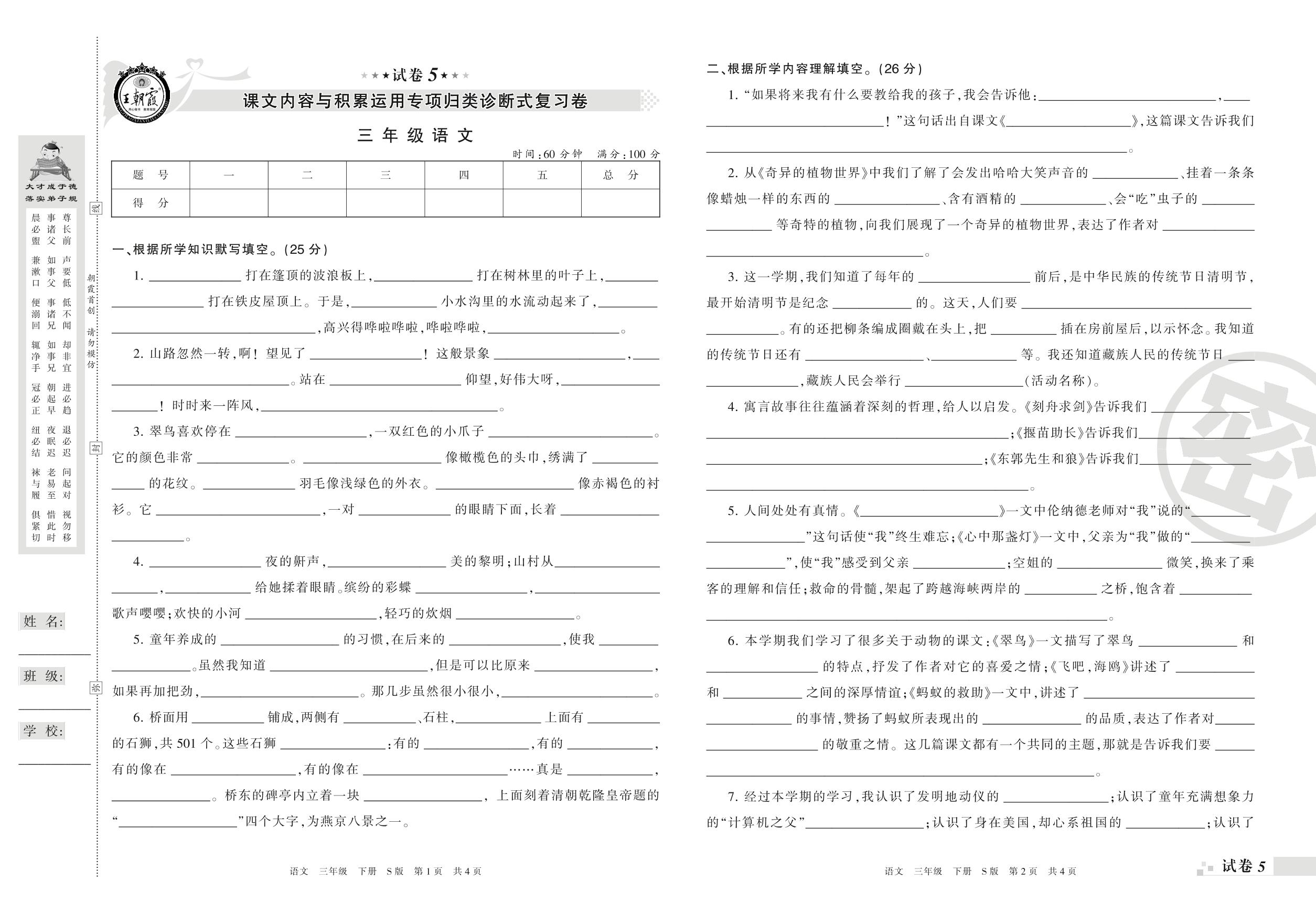王朝霞期末专项卷——课文内容与积累运用专项归类诊断式复习卷三年级下册语文(S版)_R210801104338【5】