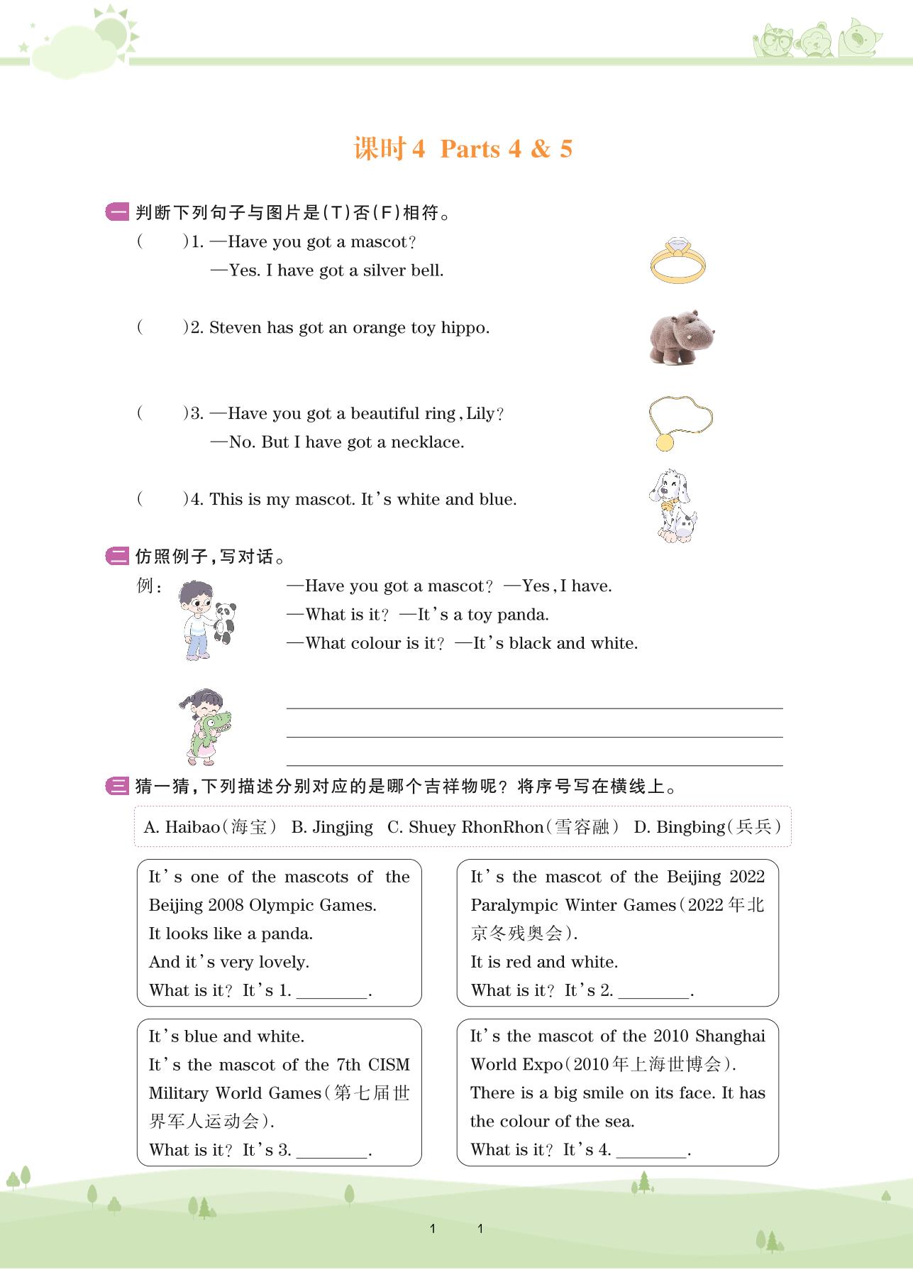 2020上册五年级英语剑桥版 Unit 2 Mascots——课时4 Parts 4 & 5