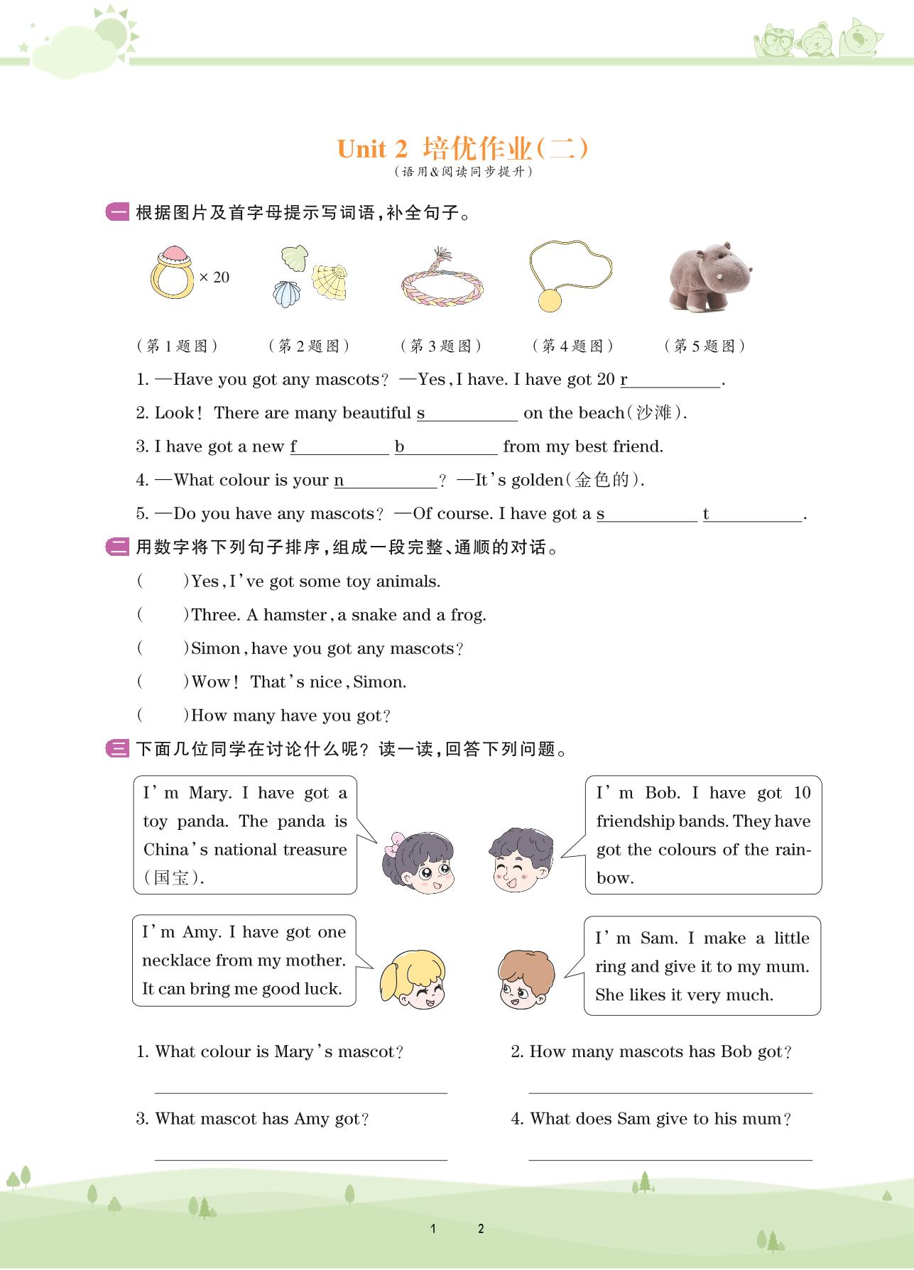 2020上册五年级英语剑桥版 Unit 2 培优作业(二)