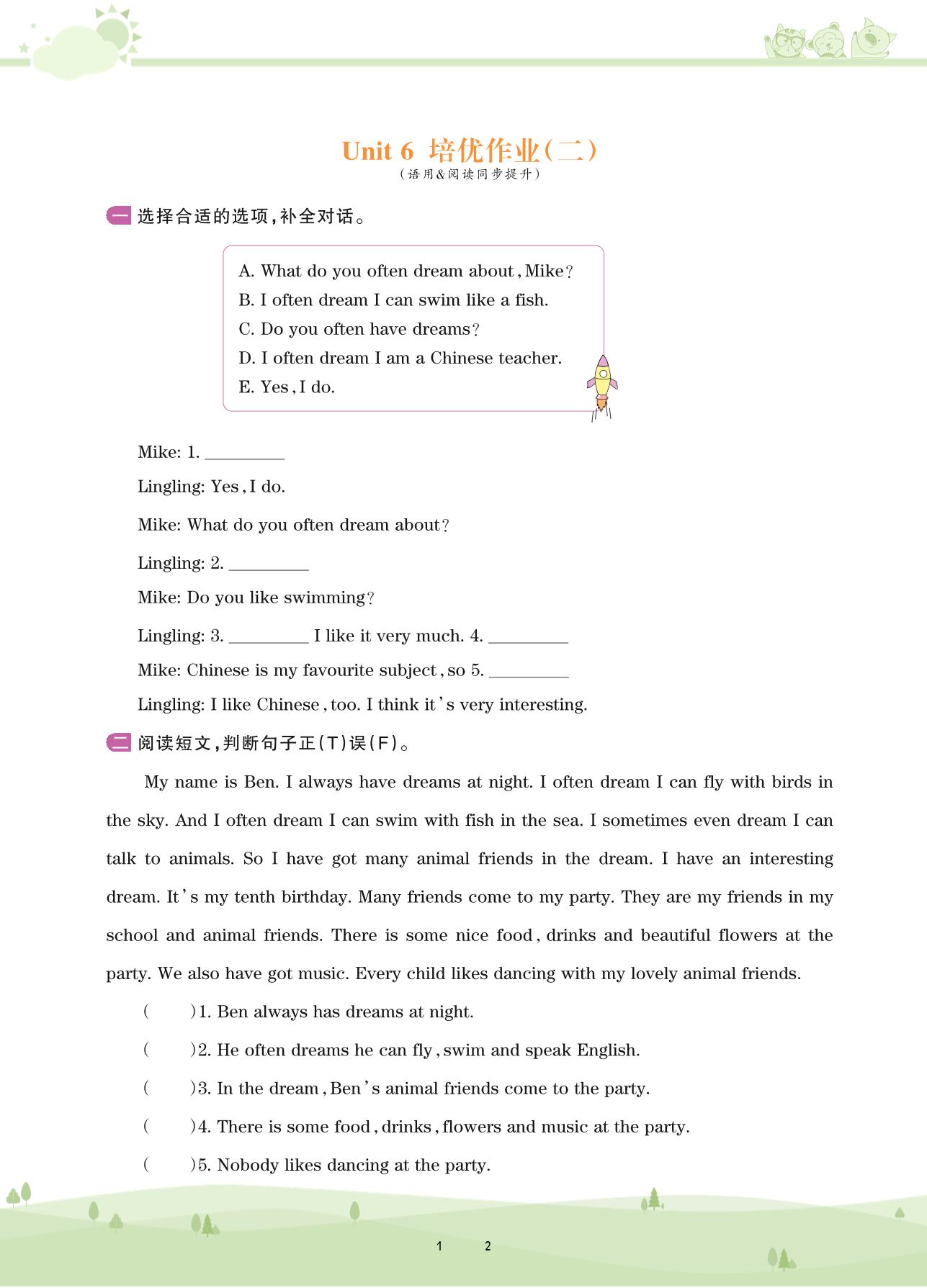 2020上册五年级英语剑桥版 Unit 6 培优作业(二)