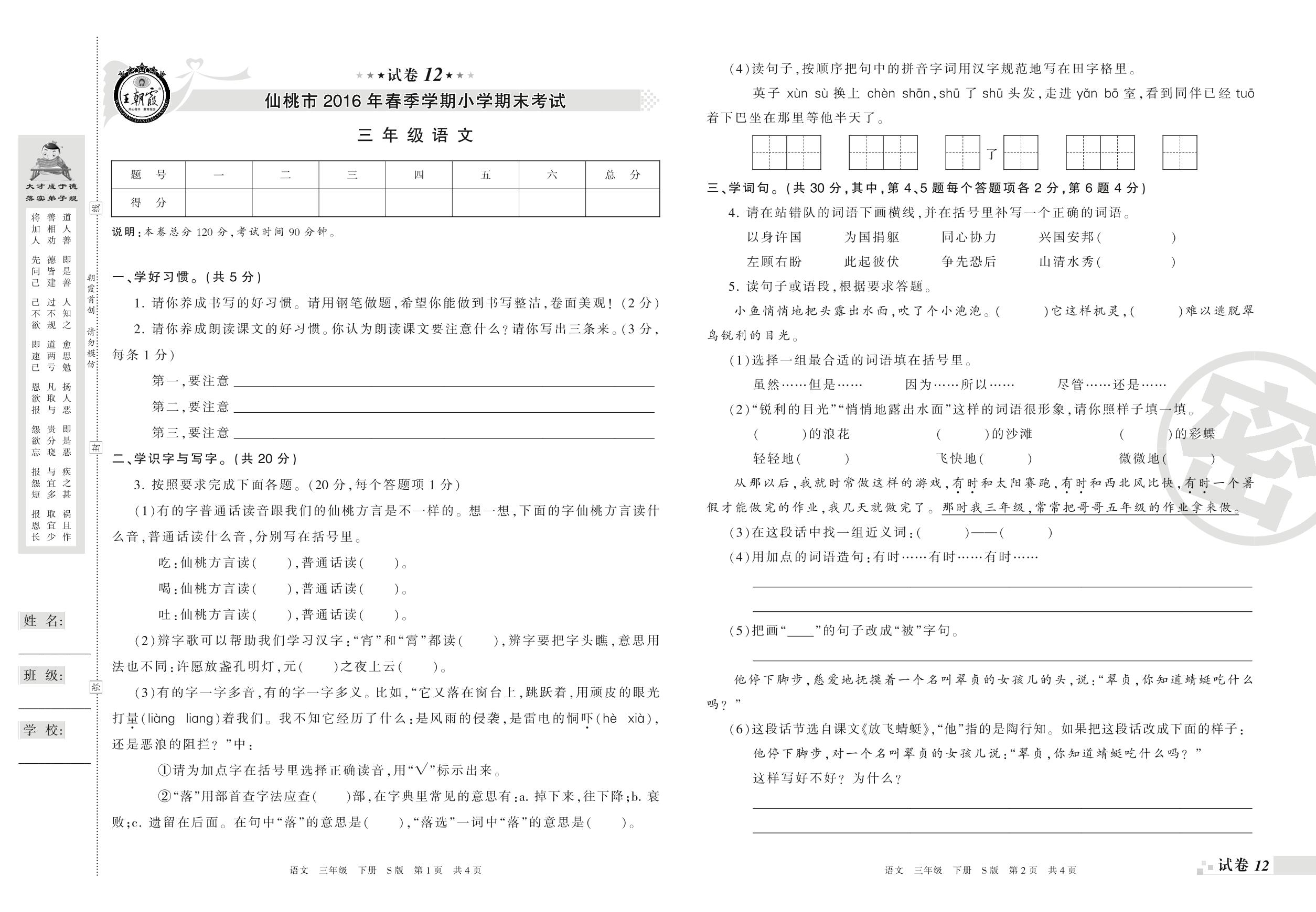 2015-2016学年第二学期仙桃市三年级语文试卷(S版)【12】