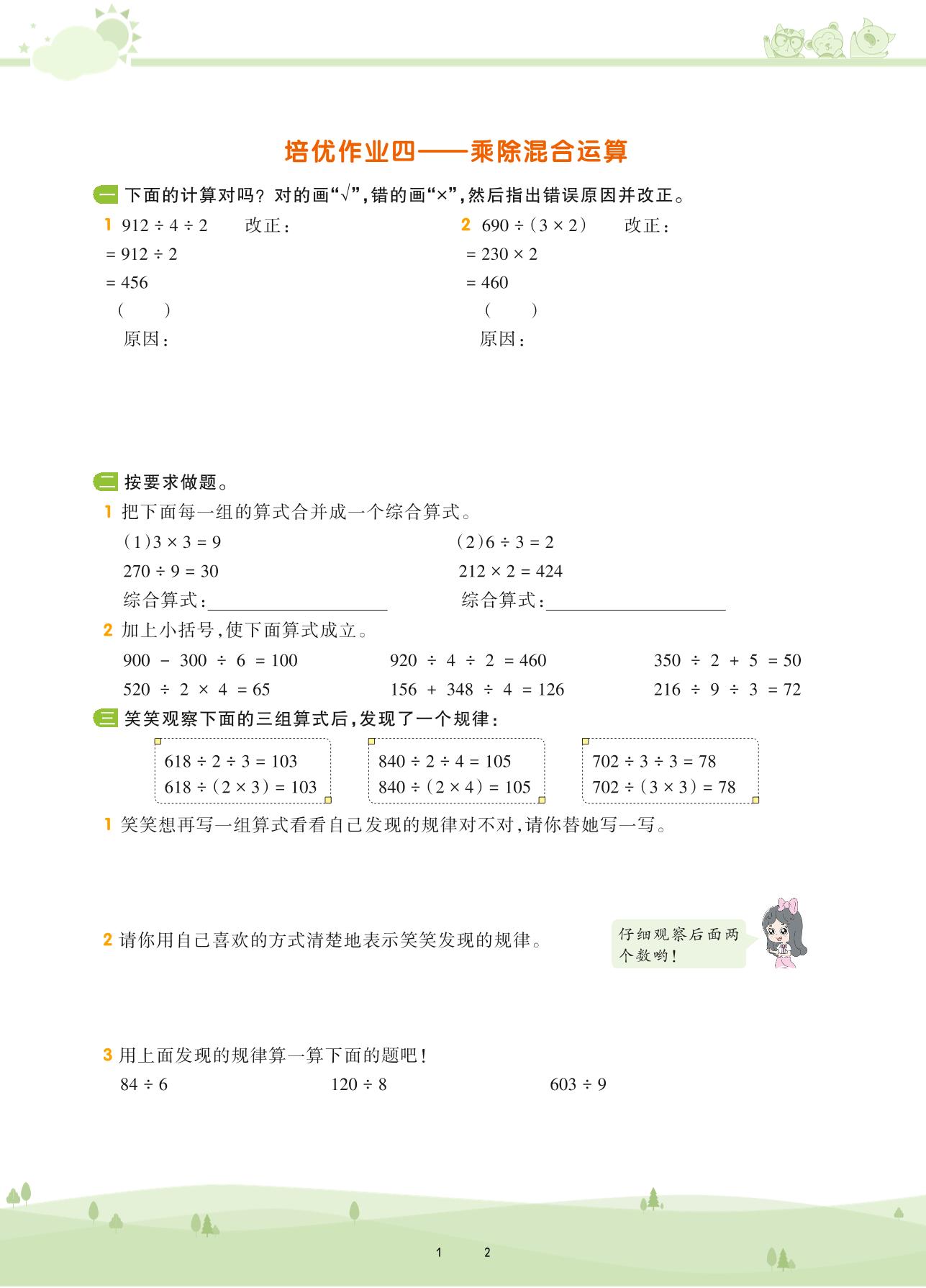 2021下册三年级数学北师版 第一单元 除 法——培优作业四 乘除混合运算