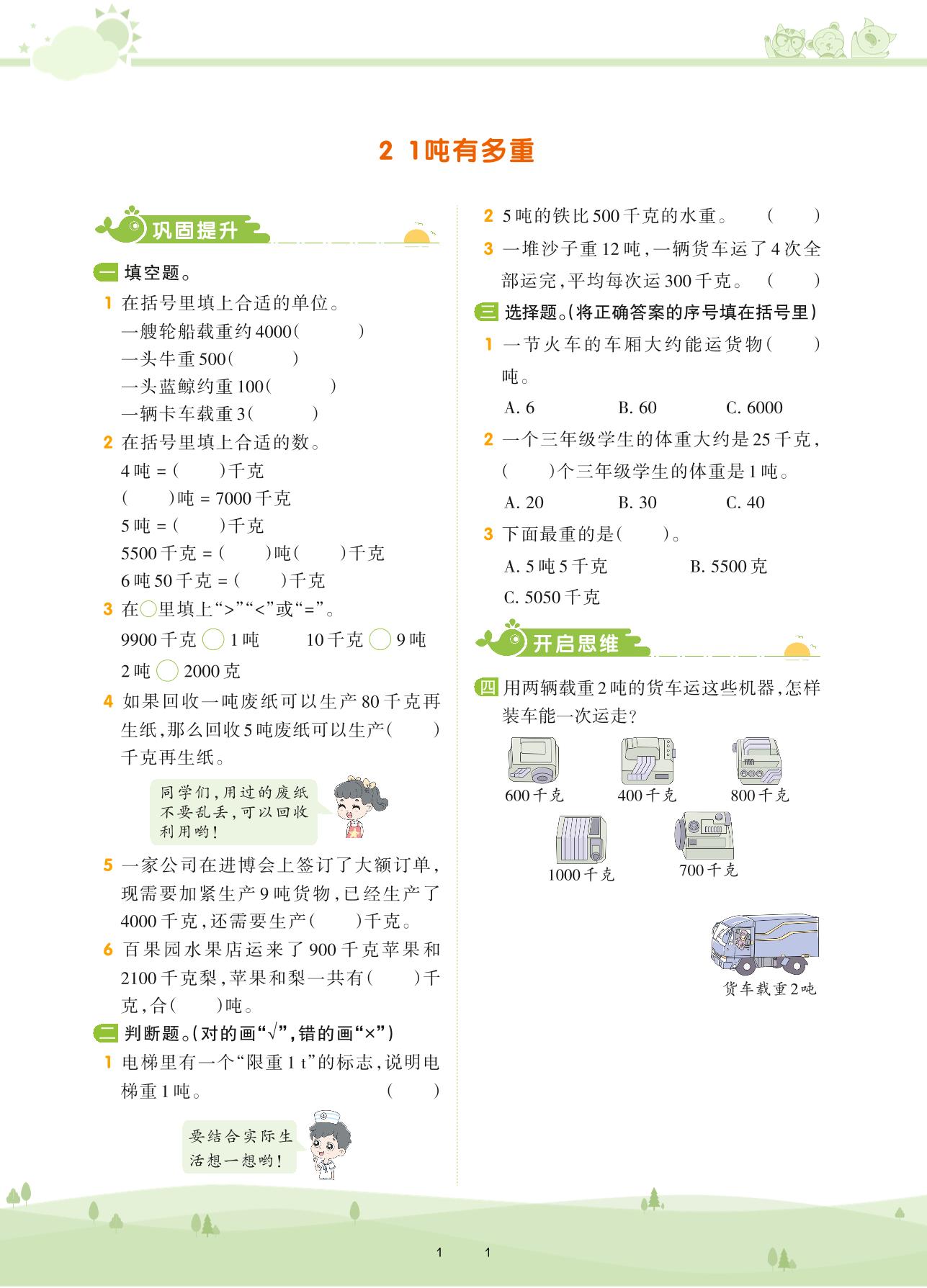 2021下册三年级数学北师版 第四单元 千克、克、吨——2 1吨有多重