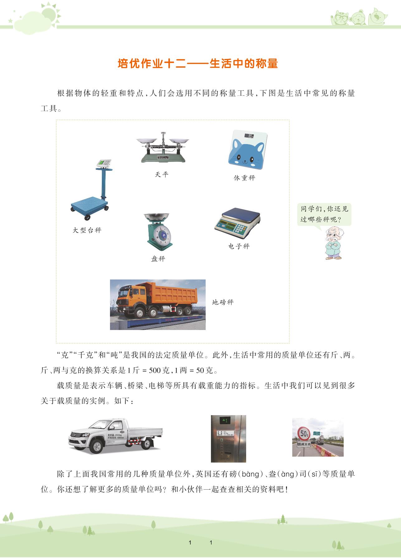 2021下册三年级数学北师版 第四单元 千克、克、吨——培优作业十二 生活中的称量