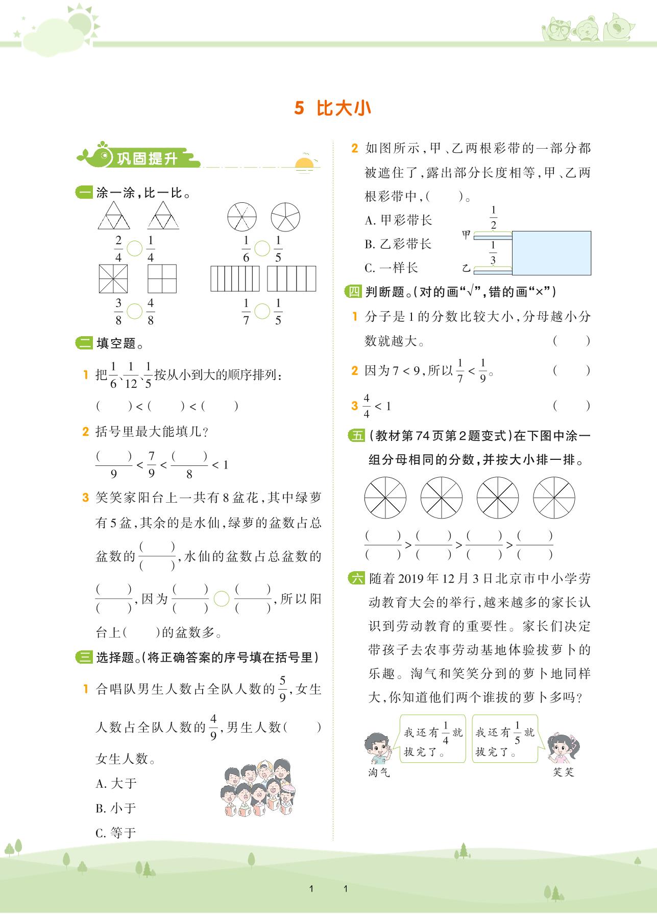 2021下册三年级数学北师版 第六单元 认识分数——5 比大小