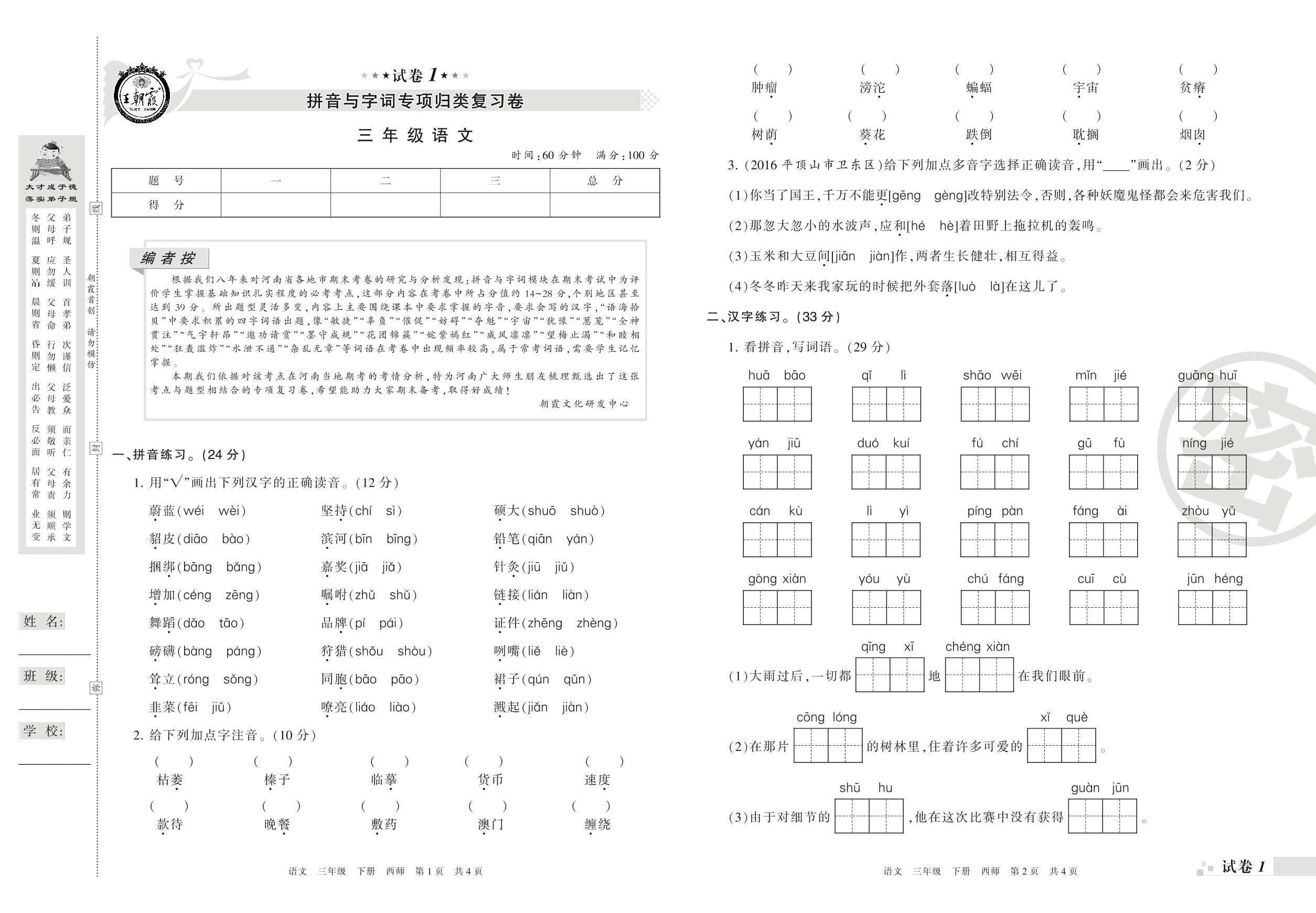王朝霞期末专项卷——拼音与字词专项归类复习卷三年级下册语文(西师版)_R210801104413【1】