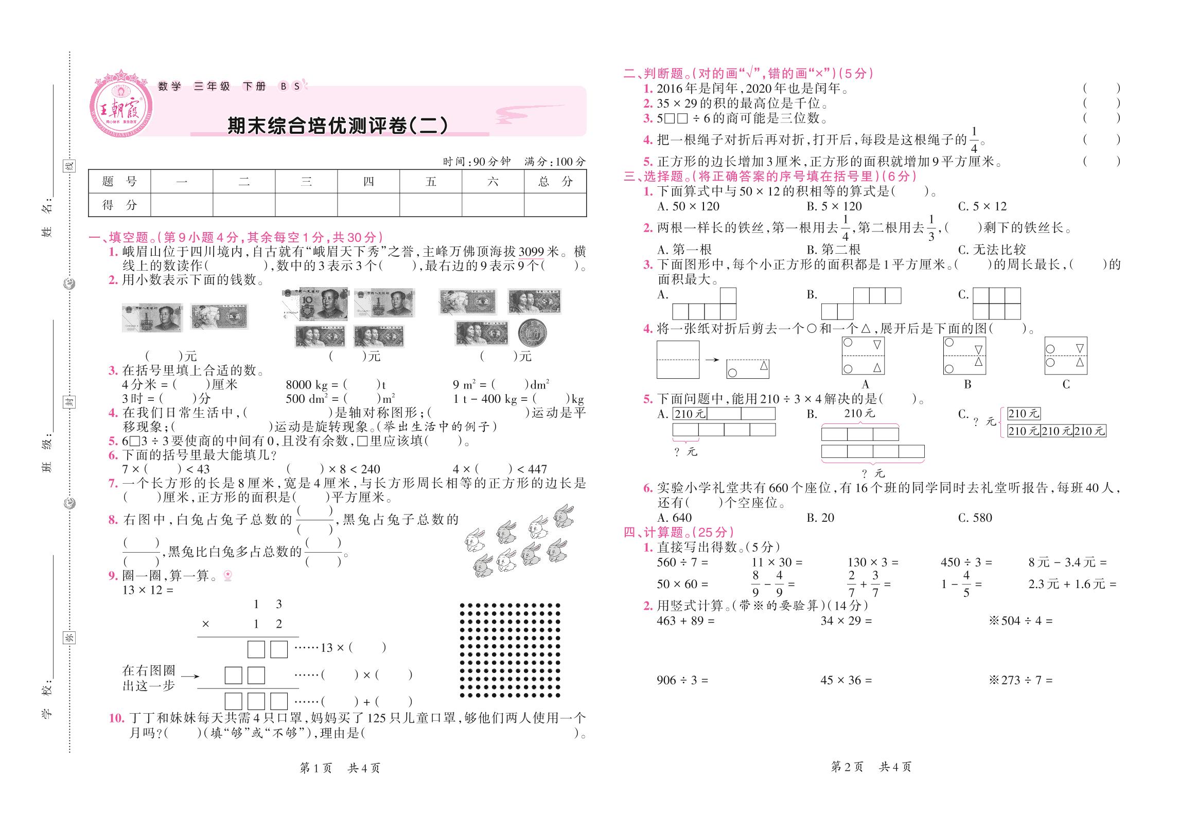 2021下册三年级数学北师版 期末综合培优测评卷(二)