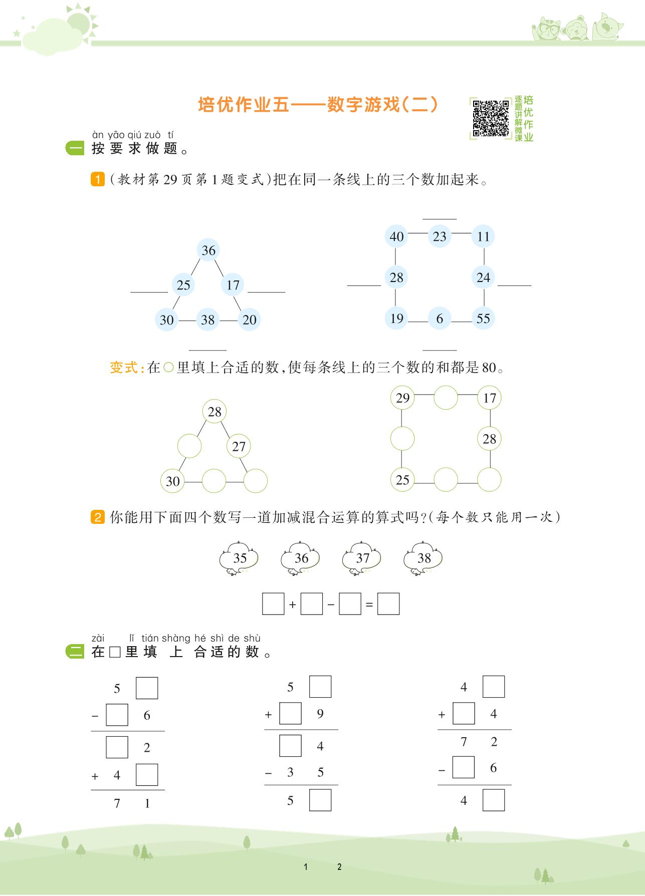 2020上册二年级数学人教版 第二单元 100以内的加法和减法(二)——培优作业五 数字游戏(二)
