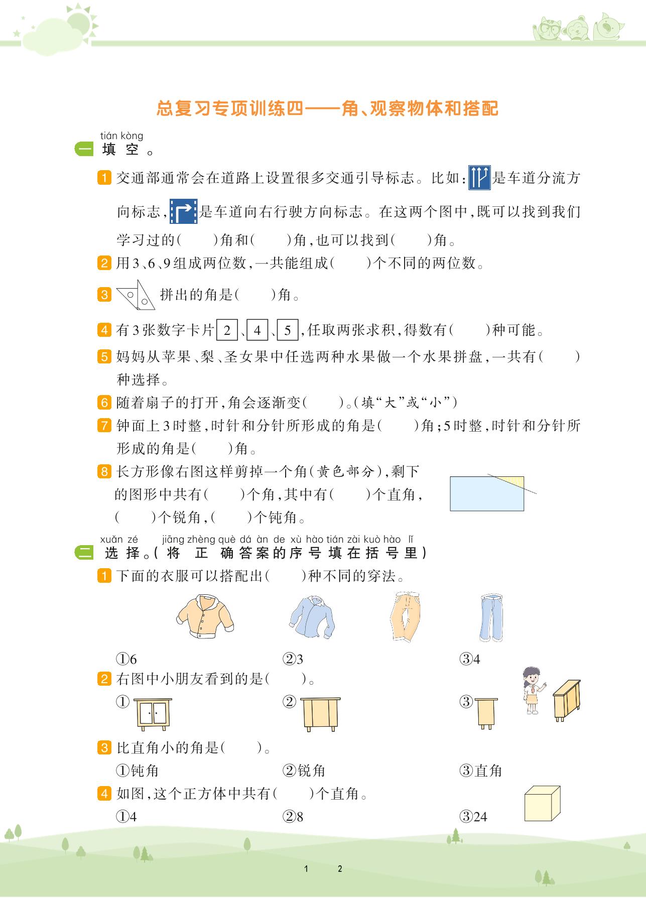 2020上册二年级数学人教版 第九单元 总复习——角、观察物体和搭配