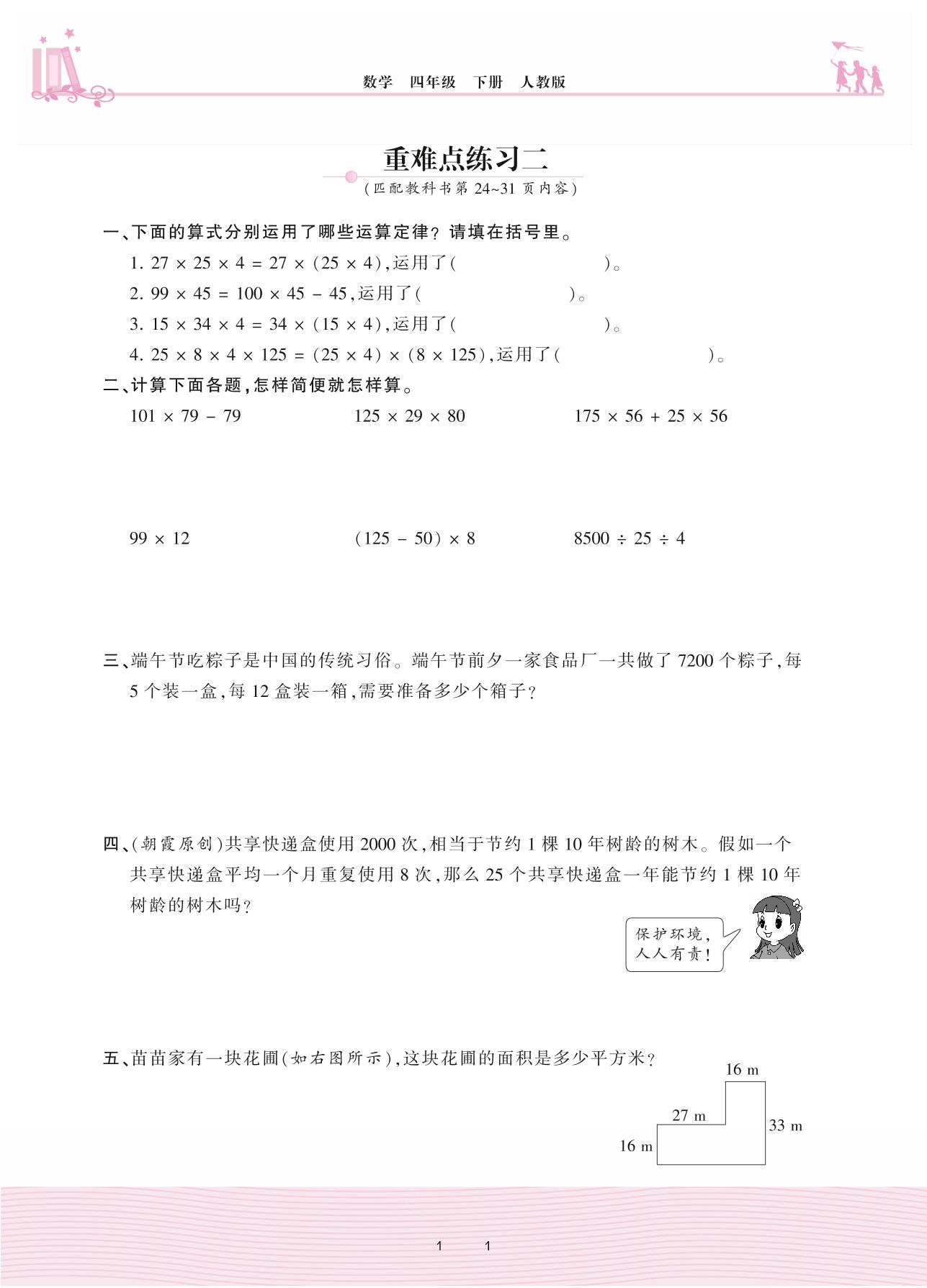 2021下册四年级数学人教版 3 运算定律——重难点练习二