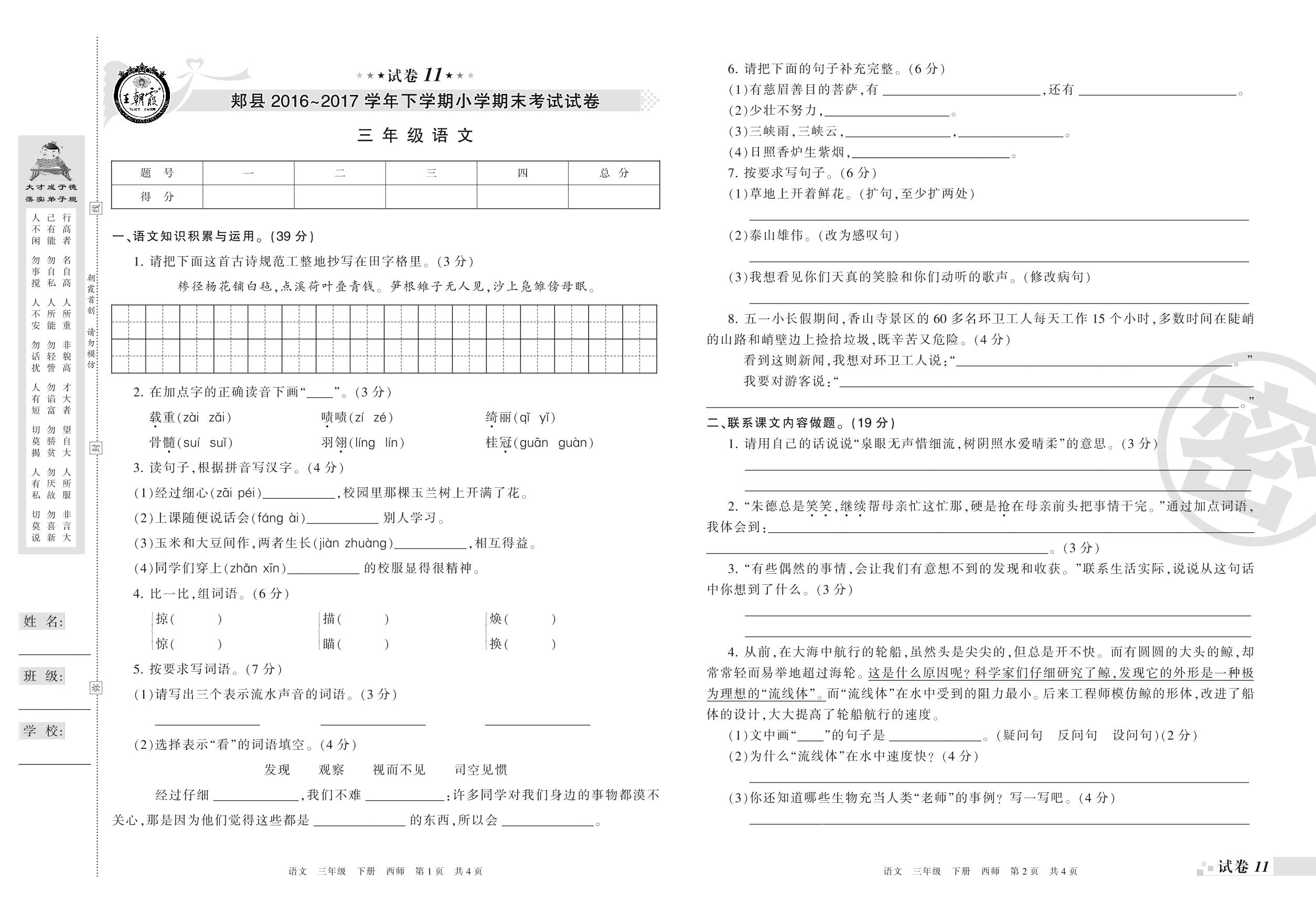 2016-2017学年第二学期平顶山市郏县三年级语文试卷(西师版)【11】