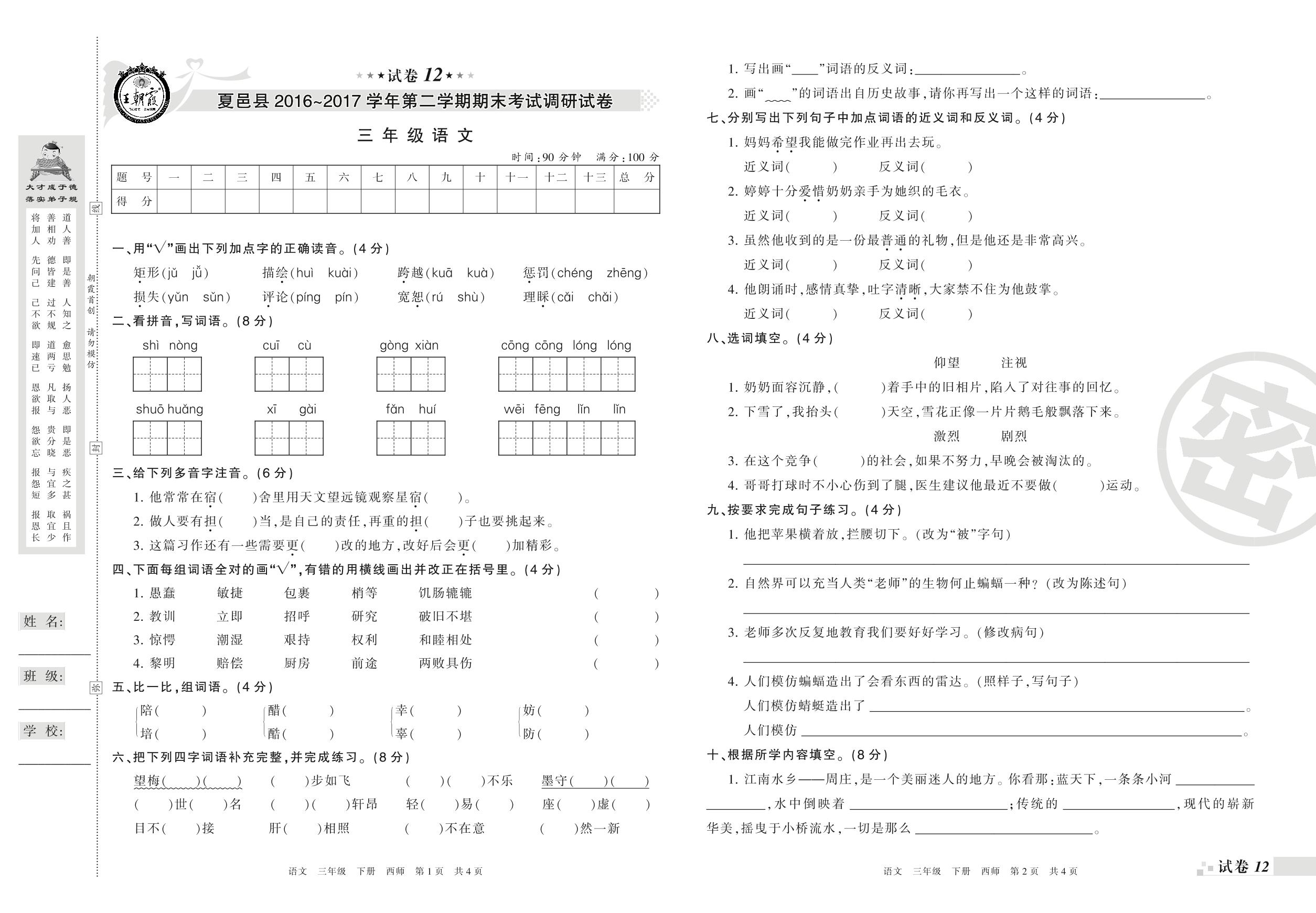 2016-2017学年第二学期商丘市夏邑县三年级语文试卷(西师版)【12】