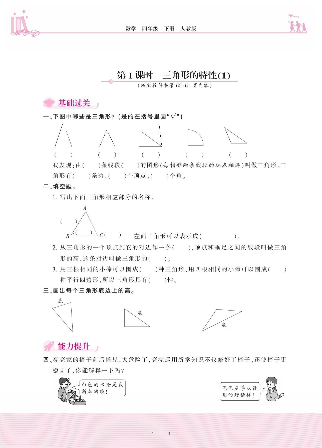2021下册四年级数学人教版 5 三角形——第1课时 三角形的特性(1)