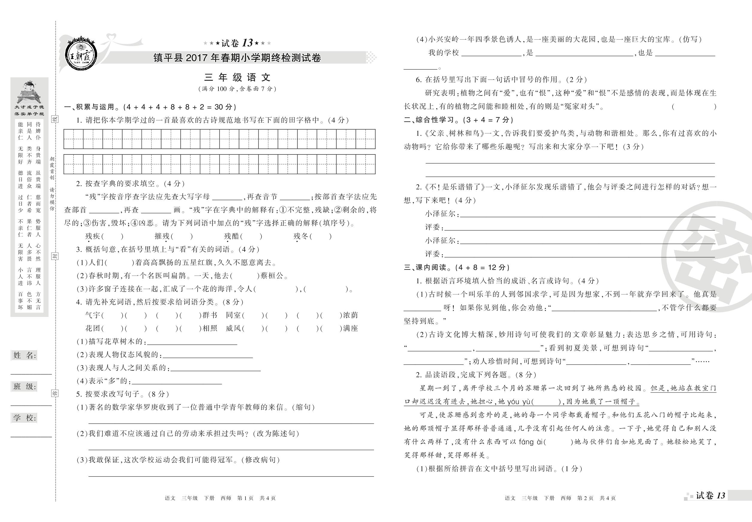 2016-2017学年第二学期南阳市镇平县三年级语文试卷(西师版)【13】
