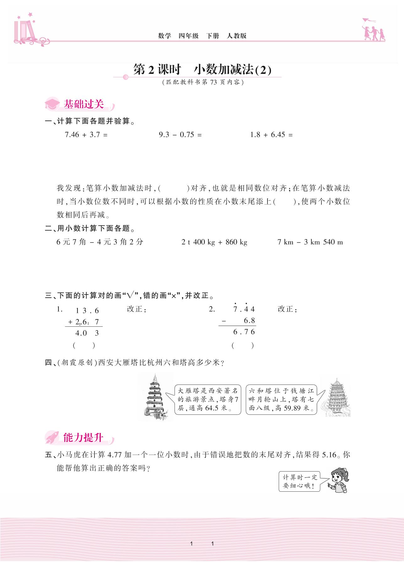 2021下册四年级数学人教版 6 小数的加法和减法——第2课时 小数加减法(2)