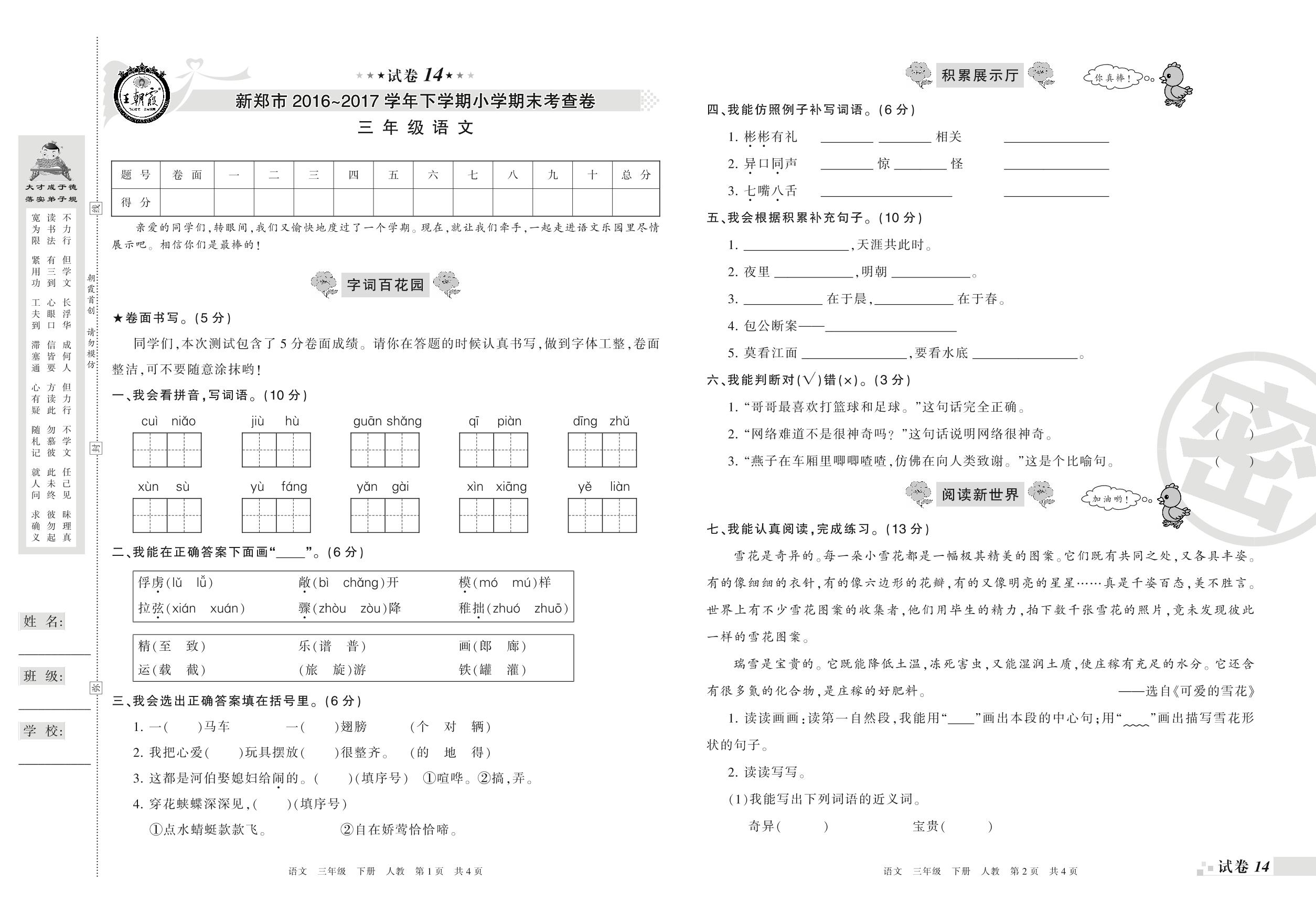 2016-2017学年第二学期新郑市三年级语文试卷(人教版)【14】