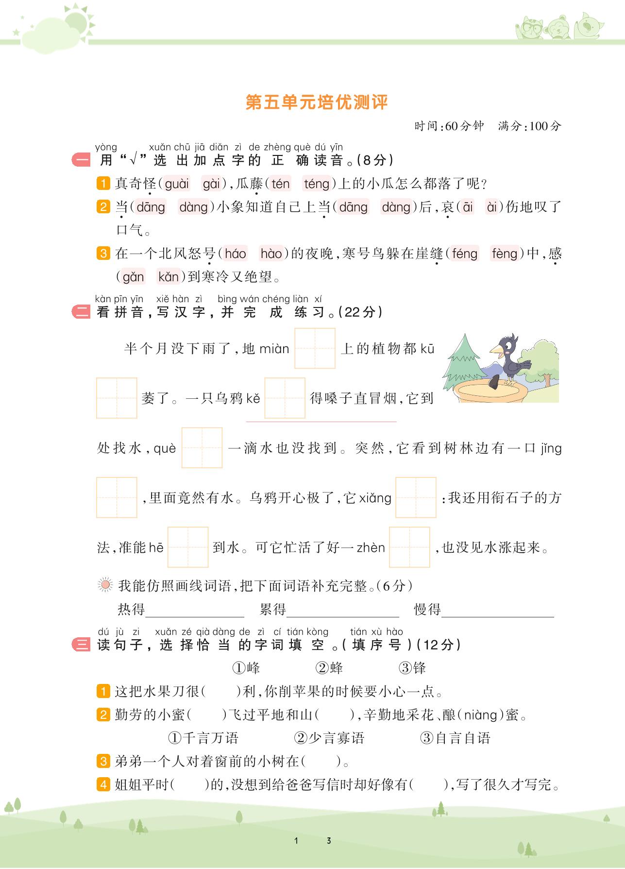 2020上册二年级语文人教版 第五单元培优测评