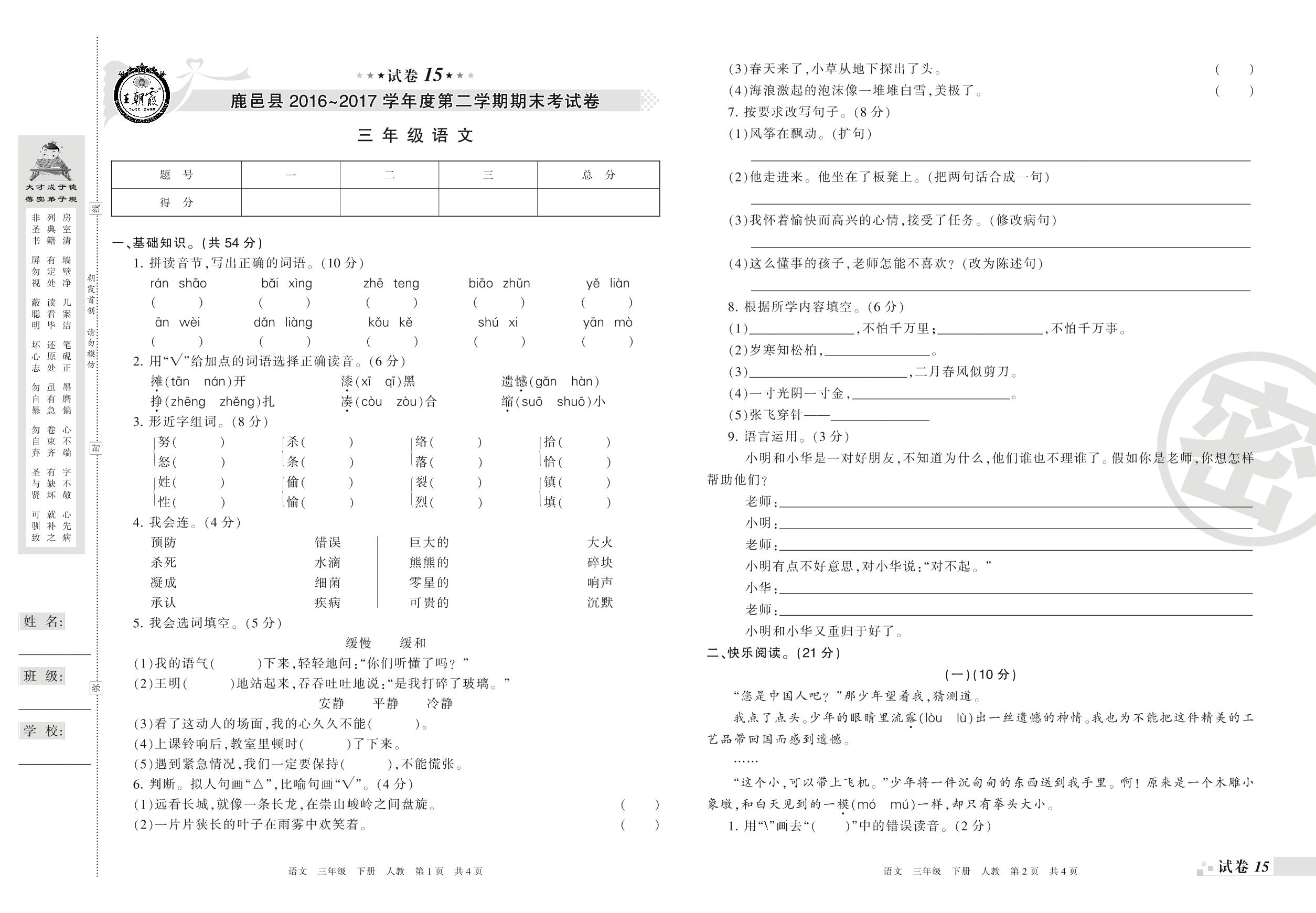 2016-2017学年第二学期周口市鹿邑县三年级语文试卷(人教版)【15】