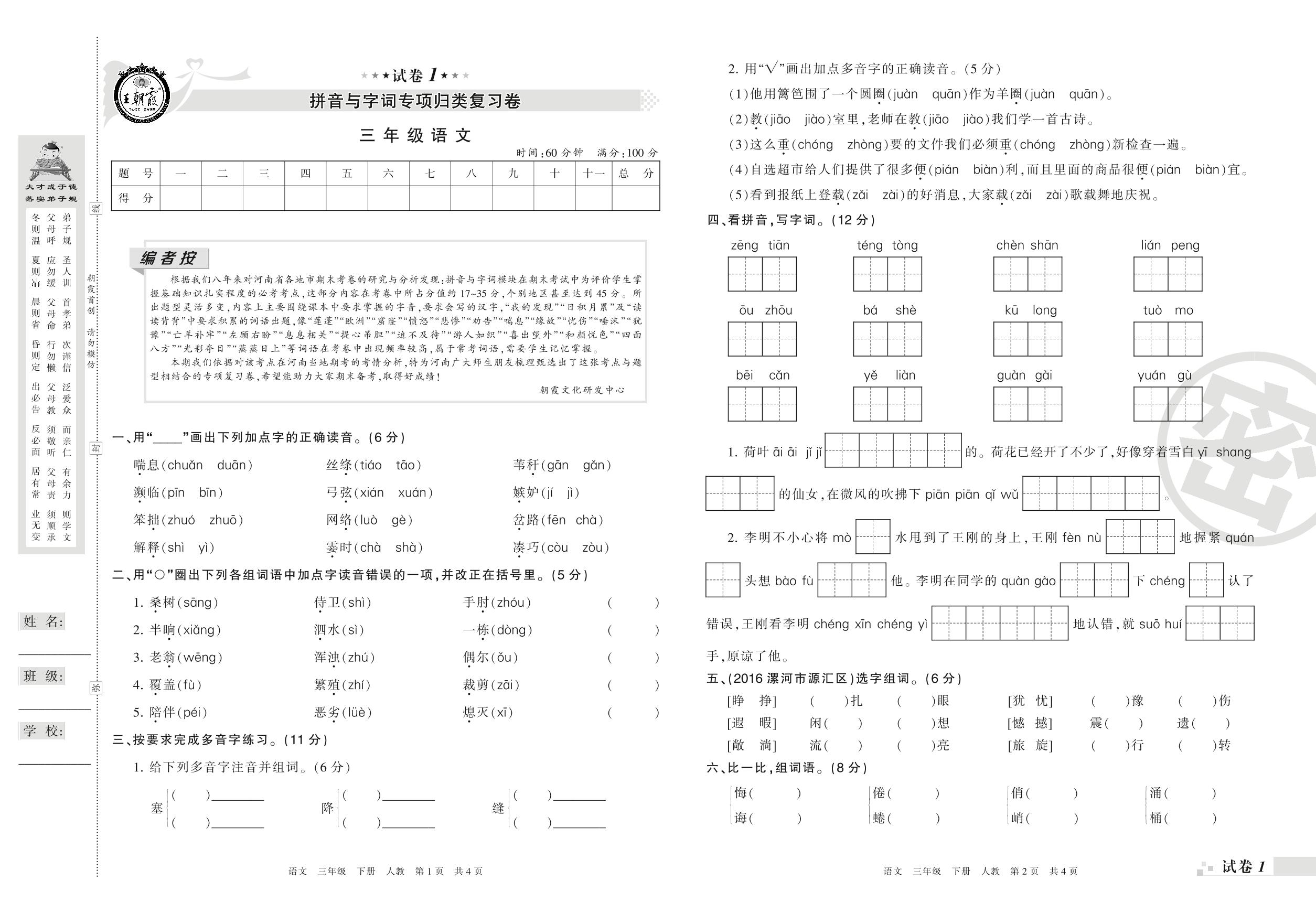 王朝霞期末专项卷——拼音与字词专项归类复习卷三年级下册语文(人教版)_R210801104517【1】