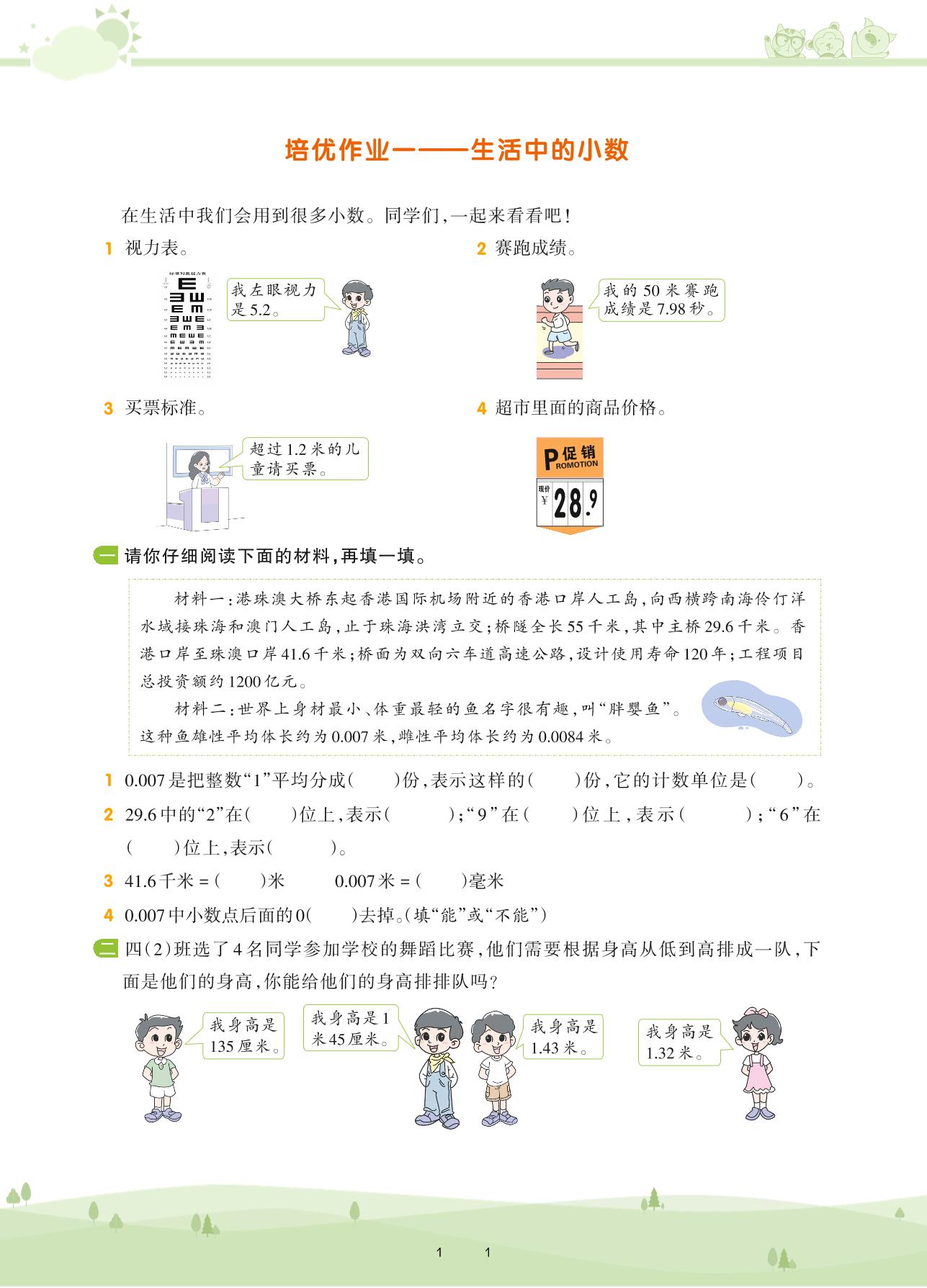 2021下册四年级数学北师版 第一单元 小数的意义和加减法——培优作业一 生活中的小数