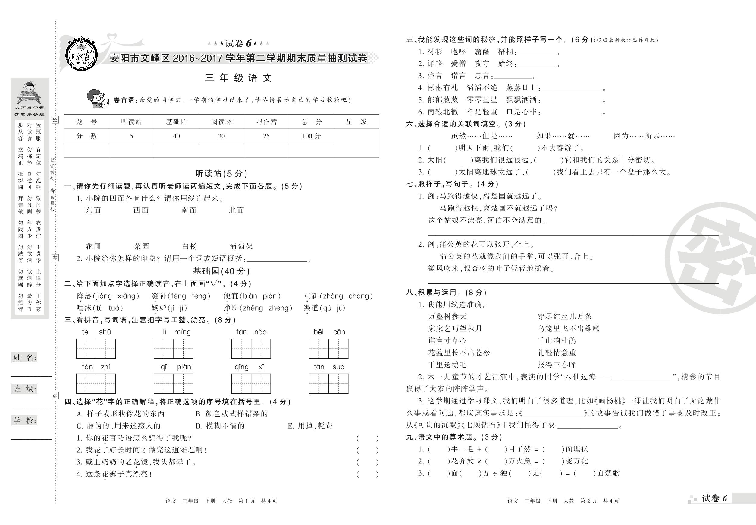 2016-2017学年第二学期安阳市文峰区三年级语文试卷(人教版)【6】